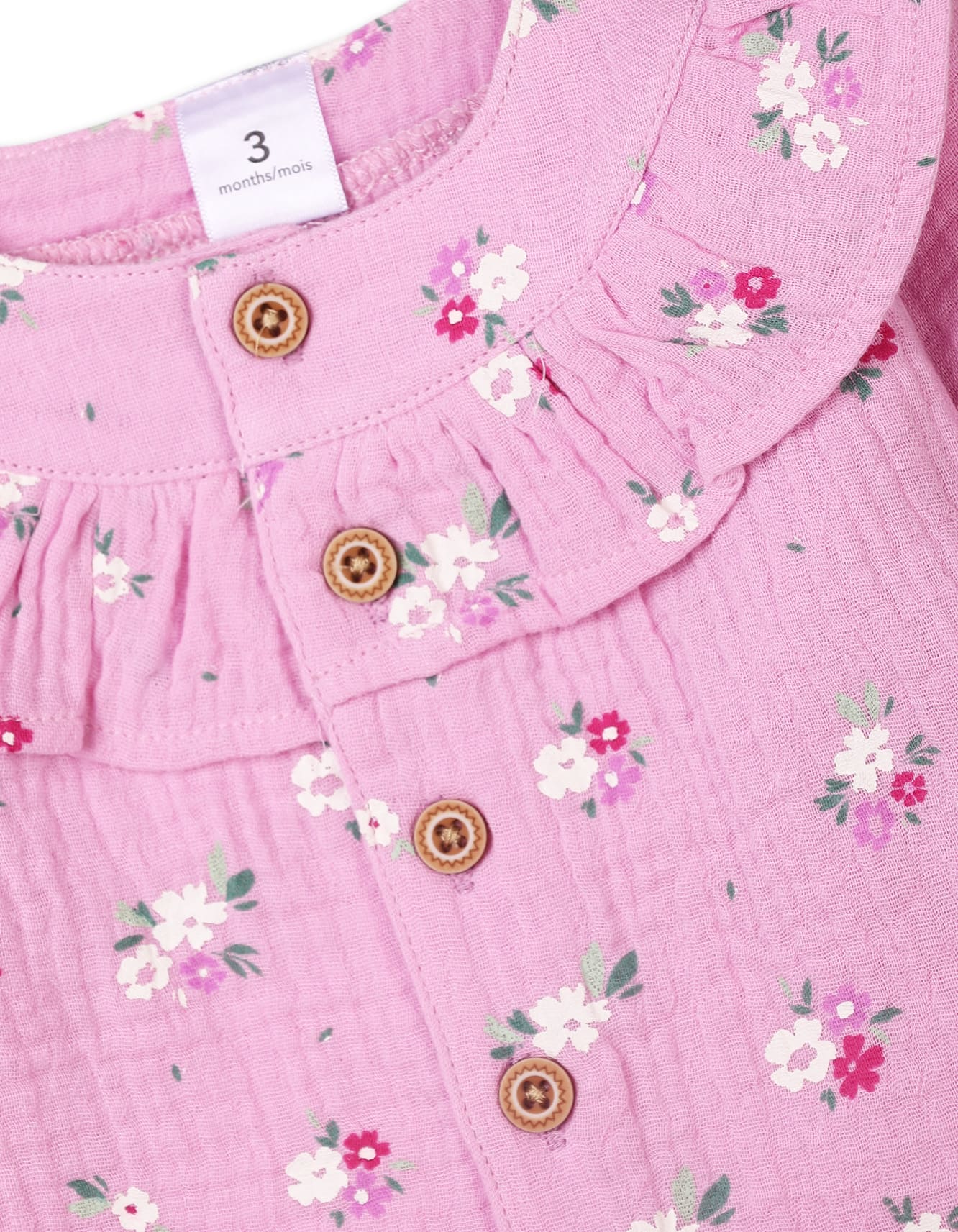 | Top Details | Floral print, ruffled neckline, wooden buttons |