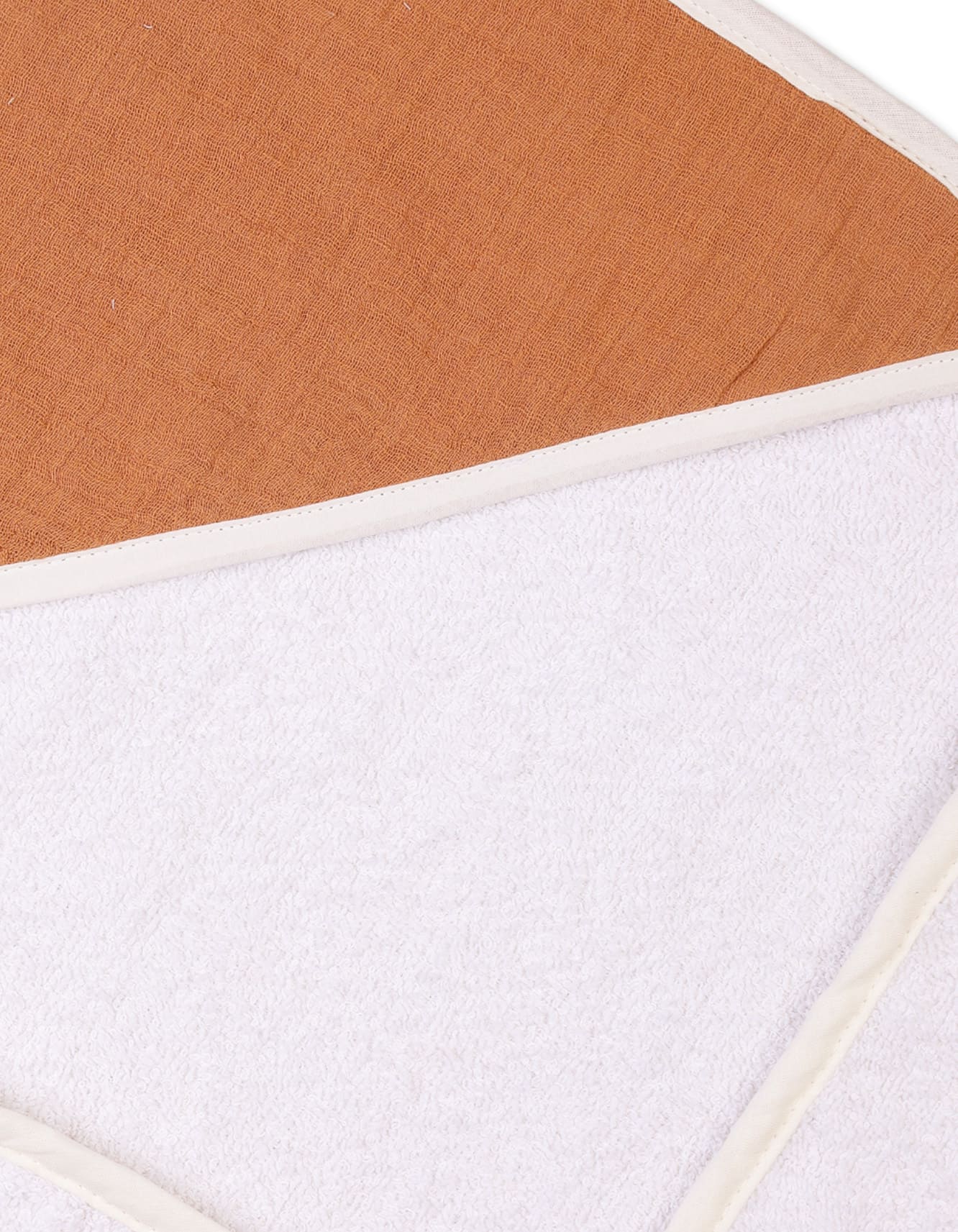 The hood features a plain rust fabric, offering a soft, calm, and elegant look. Paired with the classic white towel body, this neutral color combination is perfect for everyday baby use.