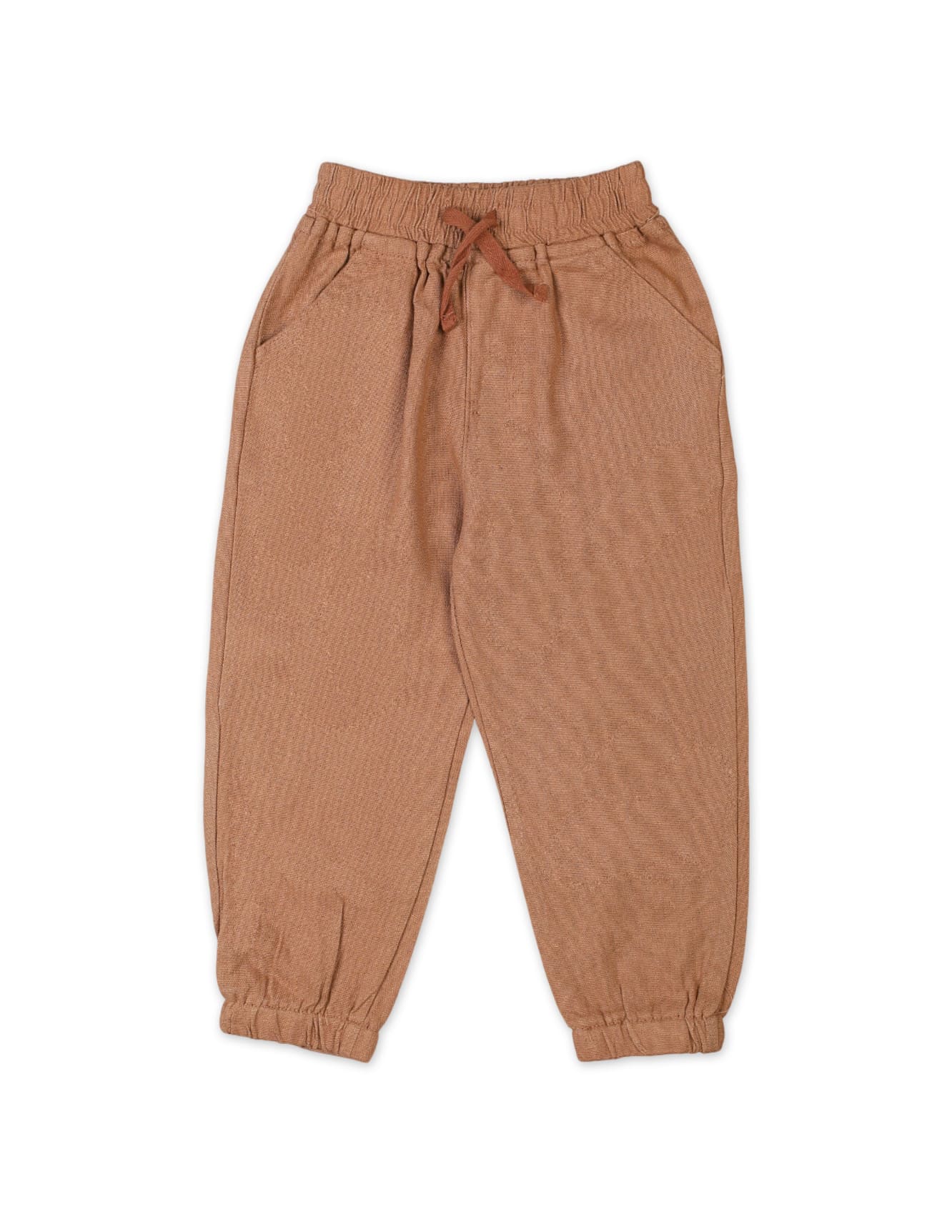 The brown pants are designed with a flexible elastic waistband and adjustable drawstring, ensuring a secure and comfortable fit for active babies. Elasticated cuffs at the ankles help keep the pants in place, making them perfect for crawling, walking, and playtime.