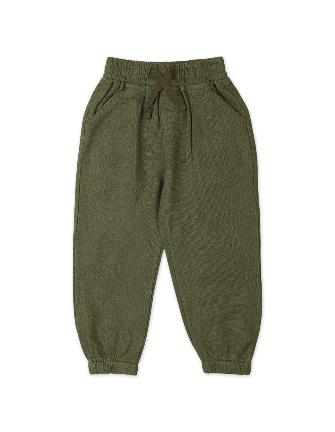 The olive green pants are designed with a flexible elastic waistband and adjustable drawstring, ensuring a secure and comfortable fit for active babies. Elasticated cuffs at the ankles help keep the pants in place, making them perfect for crawling, walking, and playtime.