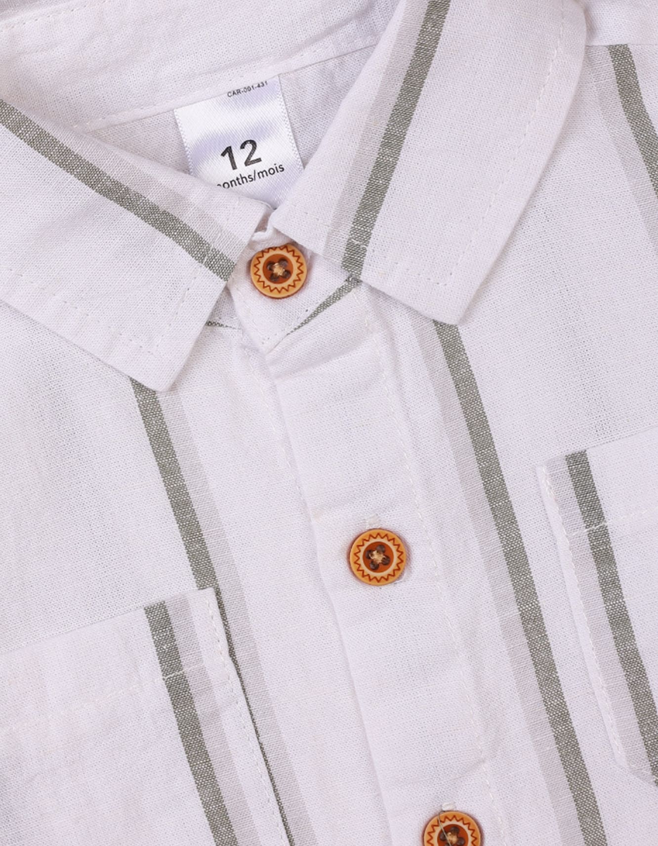 The light-colored striped shirt features a classic collar, front button closure, and chest pockets, giving it a smart yet child-friendly look. Crafted with breathable fabric, the shirt feels gentle against delicate baby skin while allowing all-day comfort.
