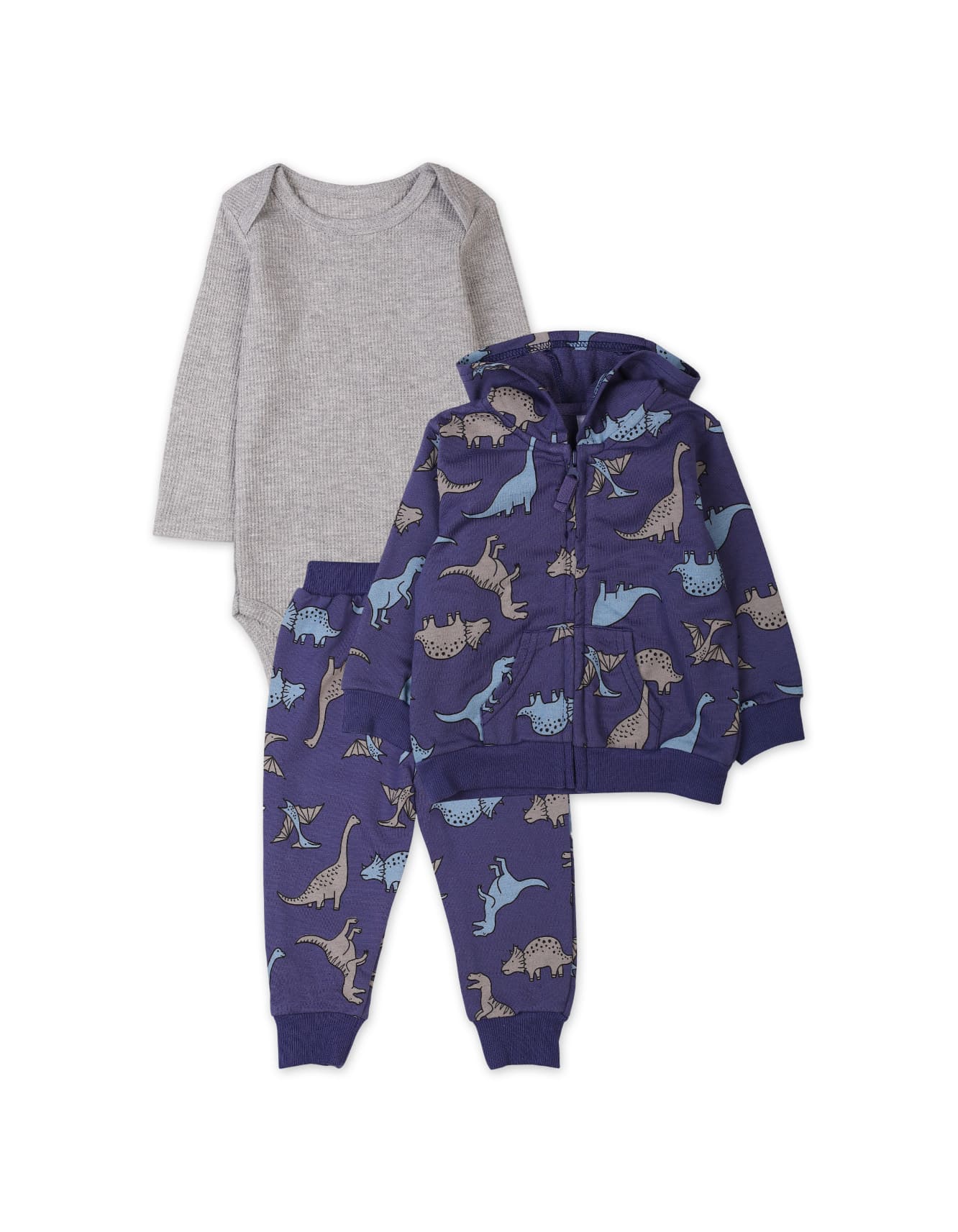 The highlight of the set is the blue hooded jacket, featuring a playful all-over dinosaur print that baby boys love. The zip-front design makes layering effortless, while the attached hood provides extra warmth during cooler days. The soft inner feel ensures comfort without irritation.
