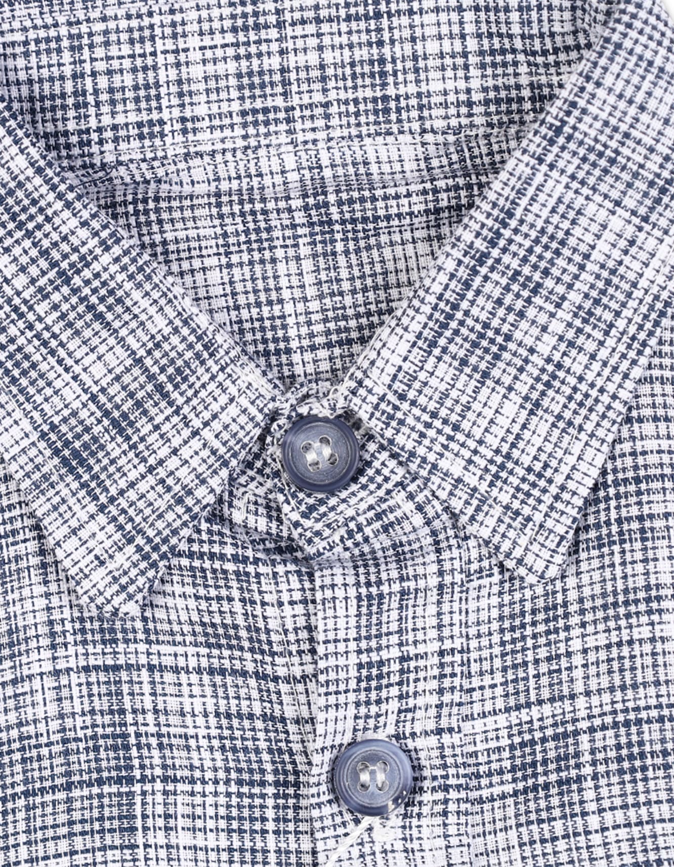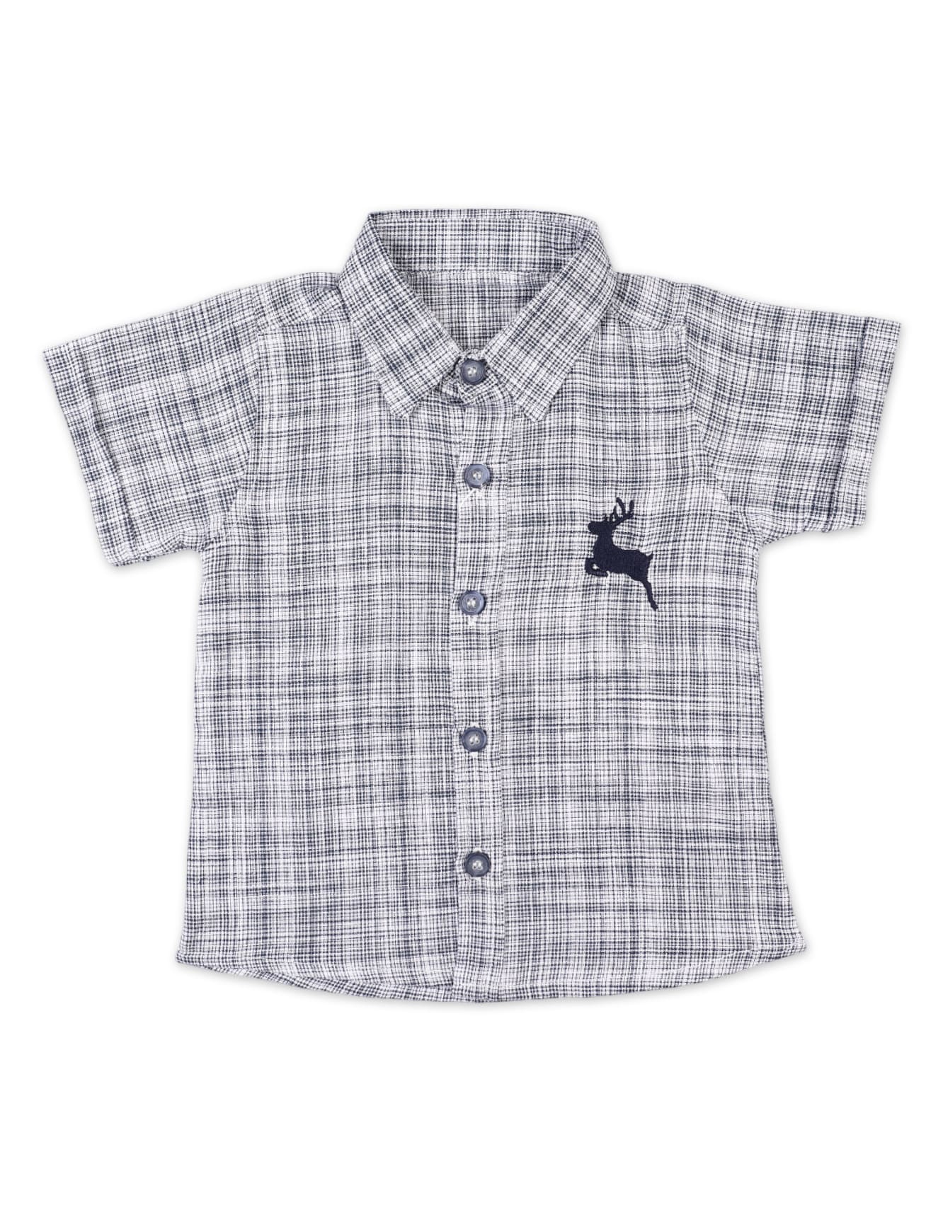 This set features a grey textured button-down shirt accented with a subtle grid pattern and a signature deer embroidery, offering a boutique look rarely found in Pakistan. Paired with versatile navy tailored shorts, this suit is the absolute best choice for summer weddings, Aqiqa ceremonies, or formal family dinners.