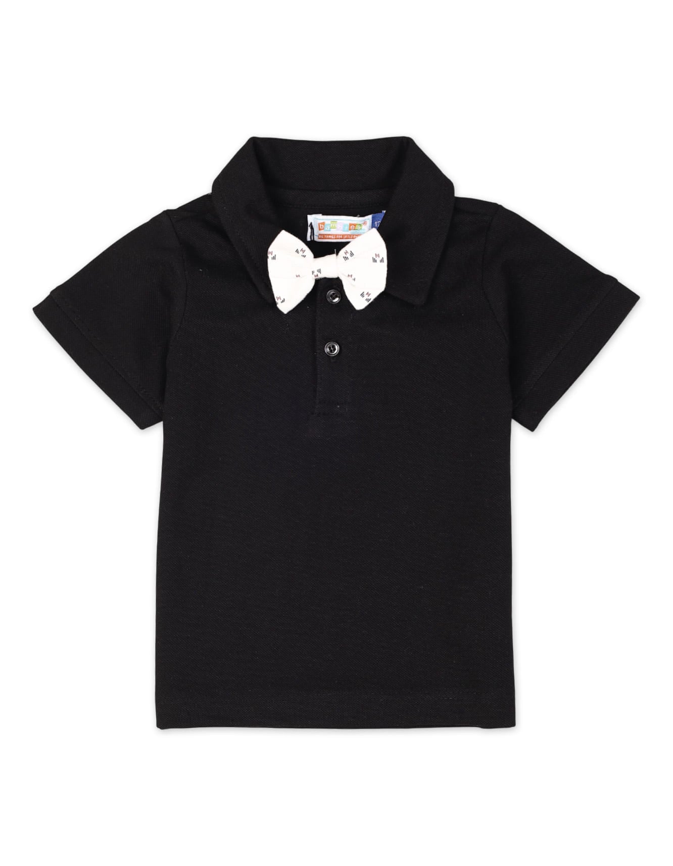 🎀 Elegant Design: Black polo shirt with white printed suspender shorts and a matching bow tie for a classy look.