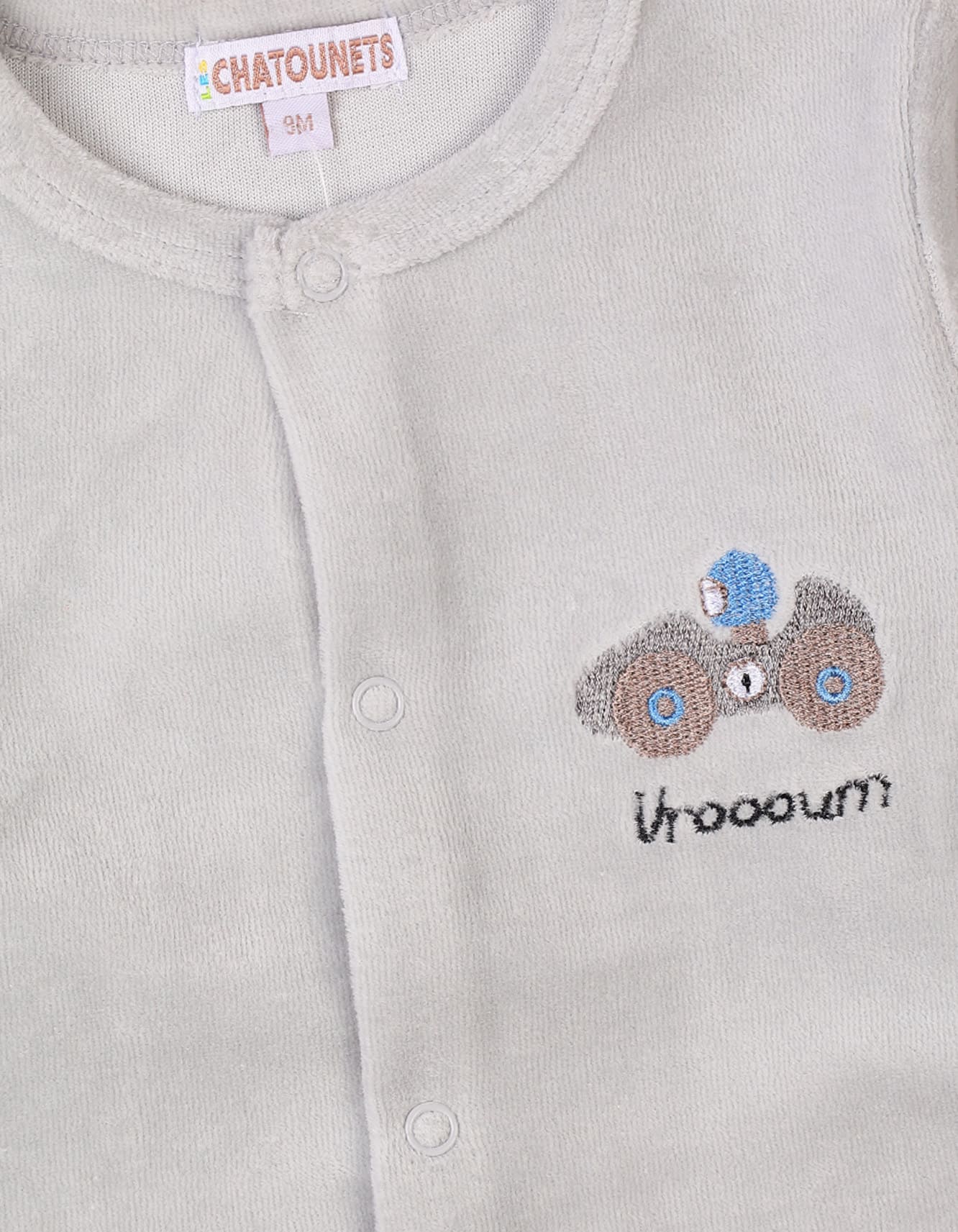 Made from ultra-soft cotton fabric, this footie onesie is gentle on your baby’s delicate skin, offering warmth without overheating. The soft gray color is complemented by a fun "Vroom" embroidered car design, creating an adorable and playful look that’s perfect for both boys and girls. The simple yet stylish design makes it ideal for casual wear, sleep, or even gifting.
