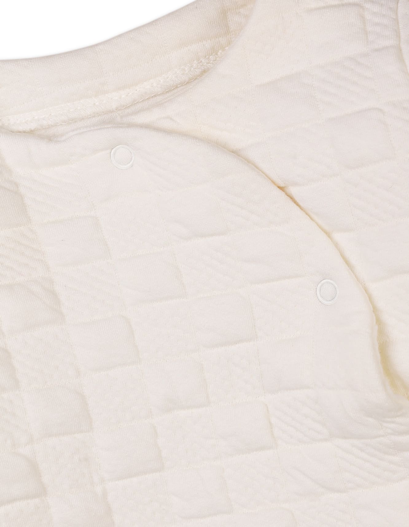 This romper is specifically engineered for winter comfort. The quilted material creates tiny air pockets that help regulate body temperature, ensuring your baby stays warm without overheating. The elegant off-white shade and sophisticated textured pattern make it an ideal choice for both everyday wear and special family gatherings.