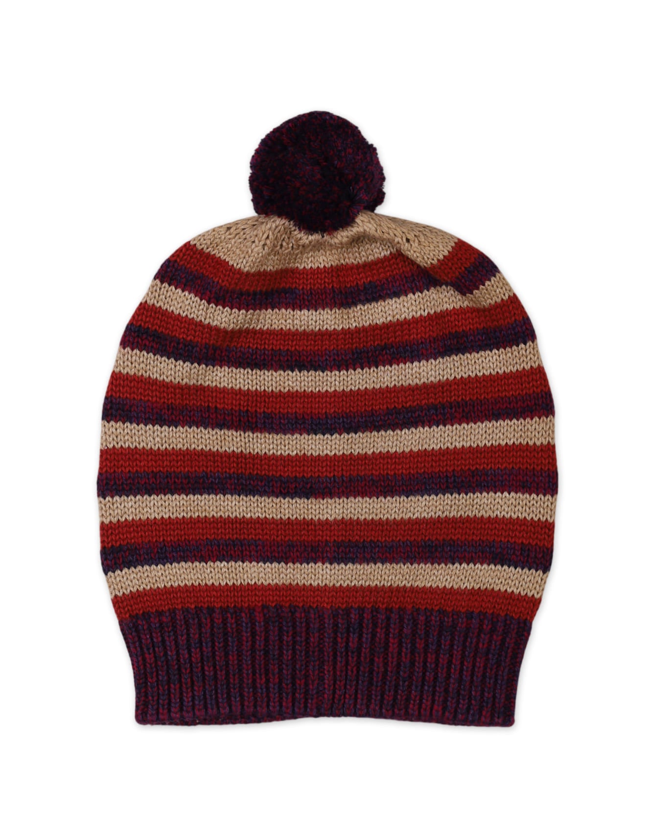 Soft striped cap designed to retain warmth and protect the baby’s head during cold weather.