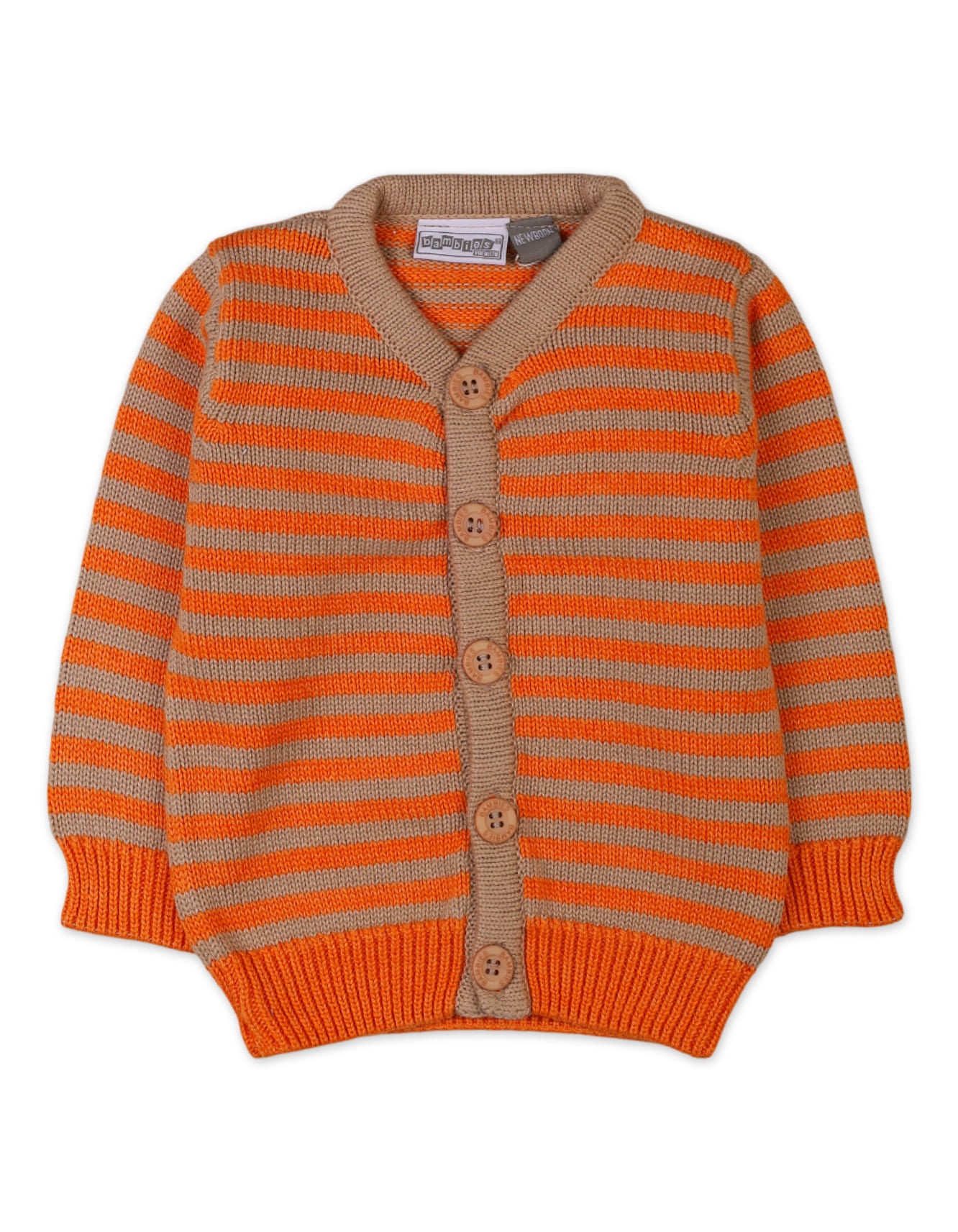 Crafted with care this winter knitwear set is gentle on delicate newborn skin while providing excellent warmth during cold weather The classic striped pattern combined with orange and beige tones and wooden style buttons gives the outfit a timeless and elegant look perfect for daily winter wear outings and newborn gifting