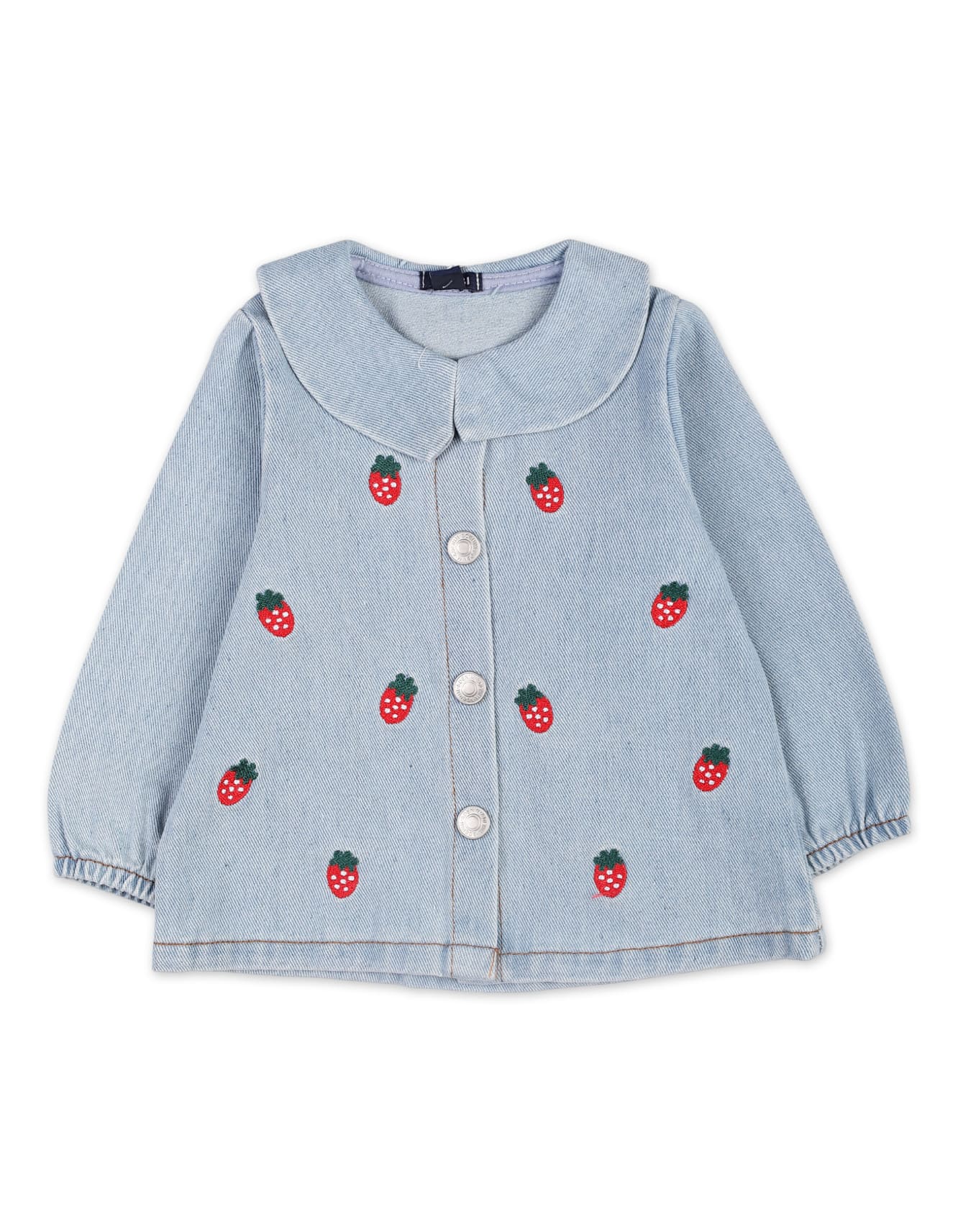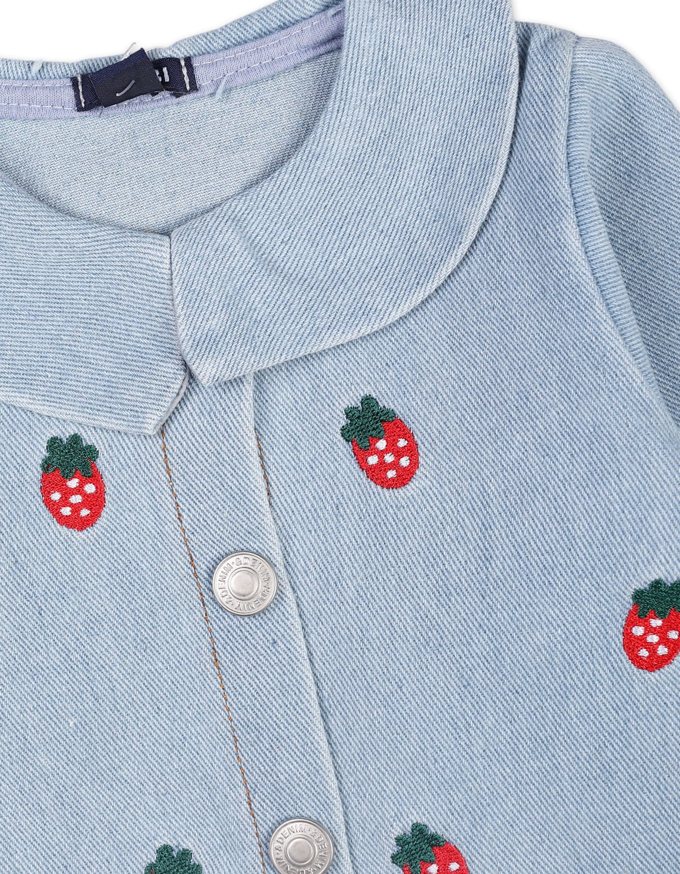 This beautifully crafted denim suit set brings together premium lightweight denim, adorable strawberry embroidery, and comfortable silhouettes—perfect for everyday wear, outings, and seasonal styling. The set includes a full-sleeve denim top with a rounded collar and matching embroidered denim pants, offering a coordinated look parents love and babies feel comfortable in.