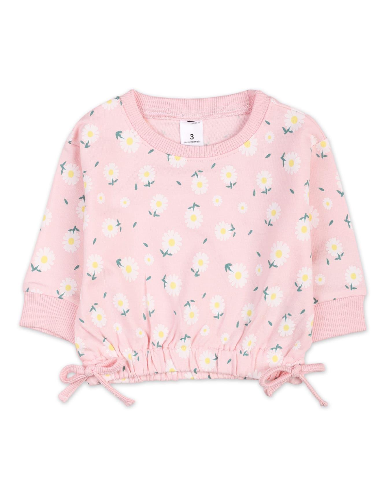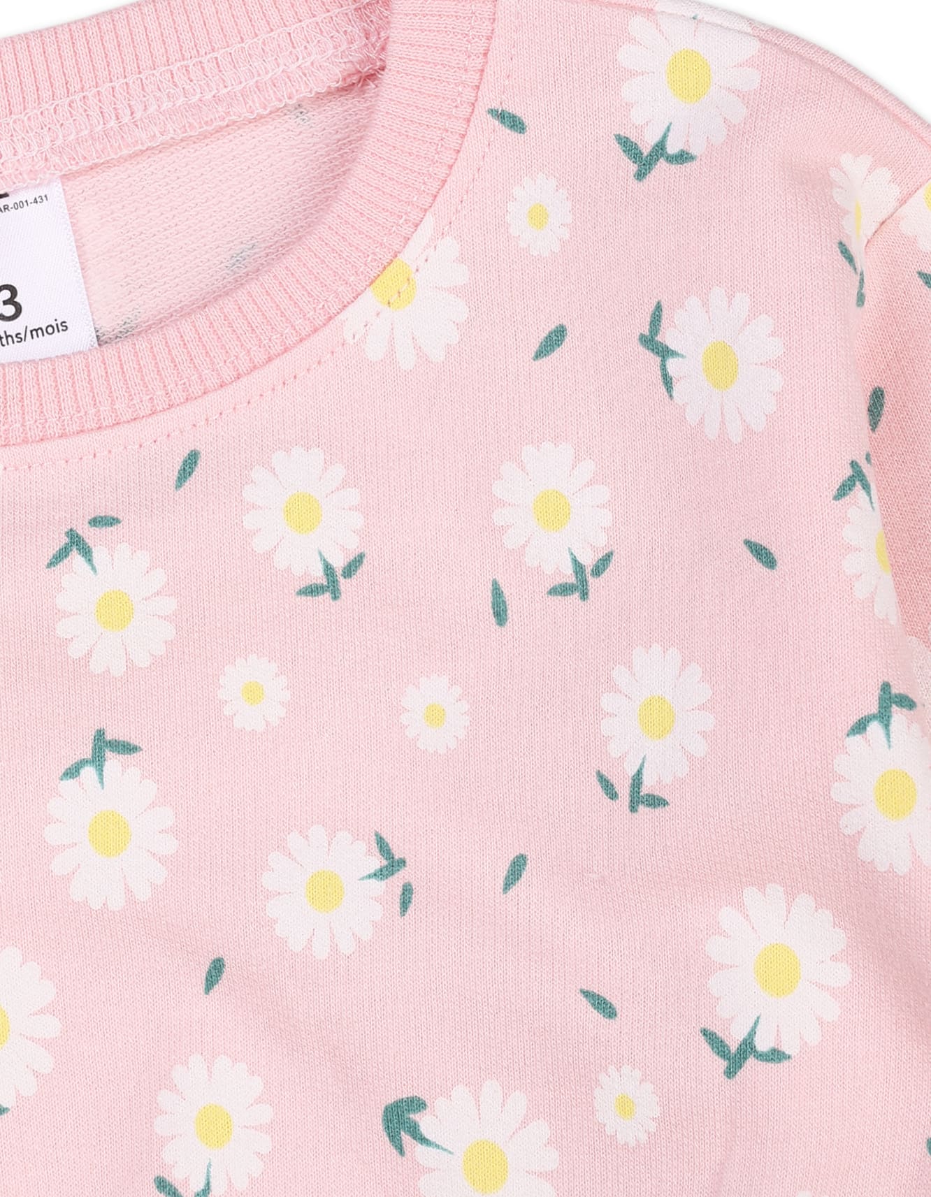 Soft cotton-blend pink top covered in delicate white and yellow daisy flowers.