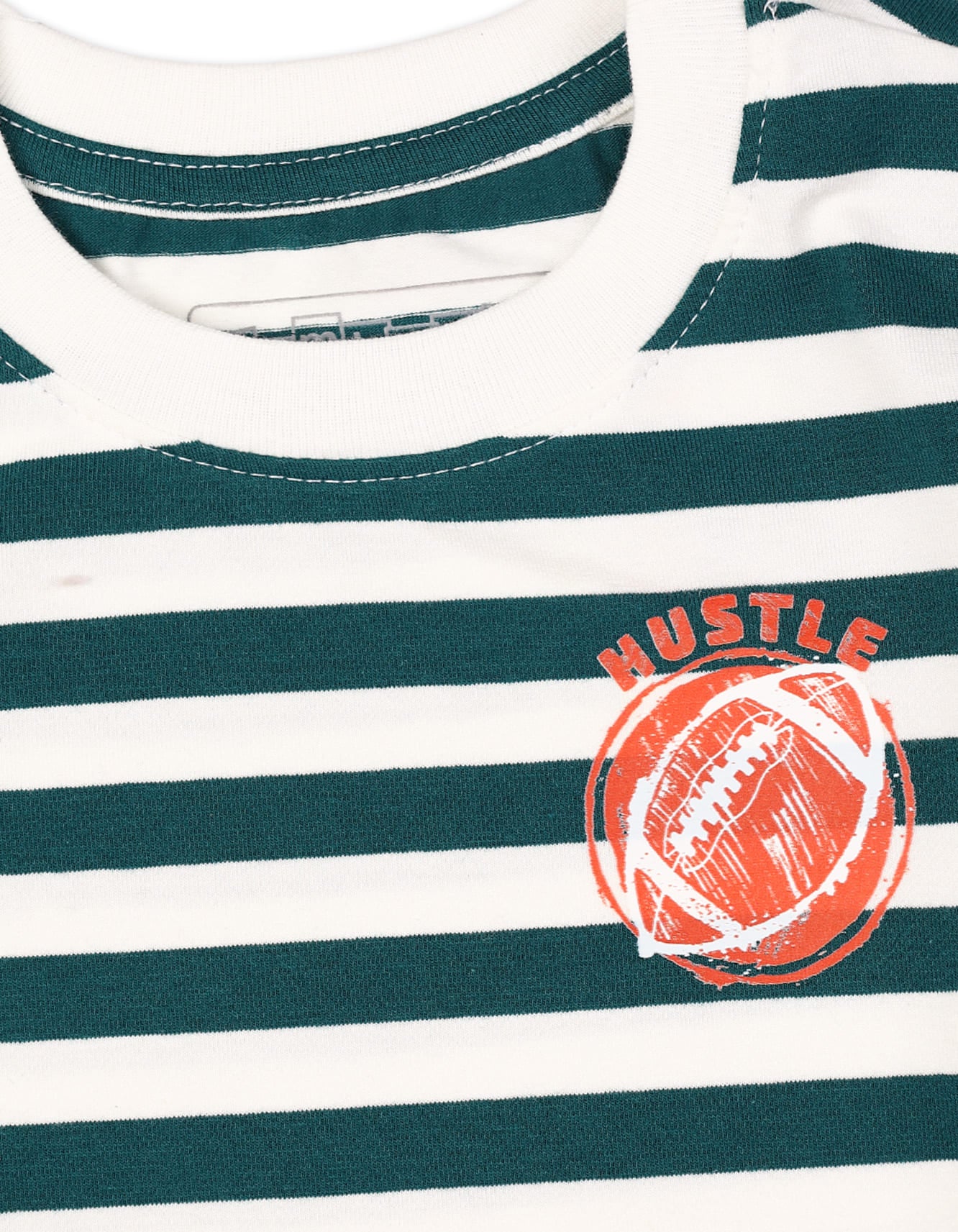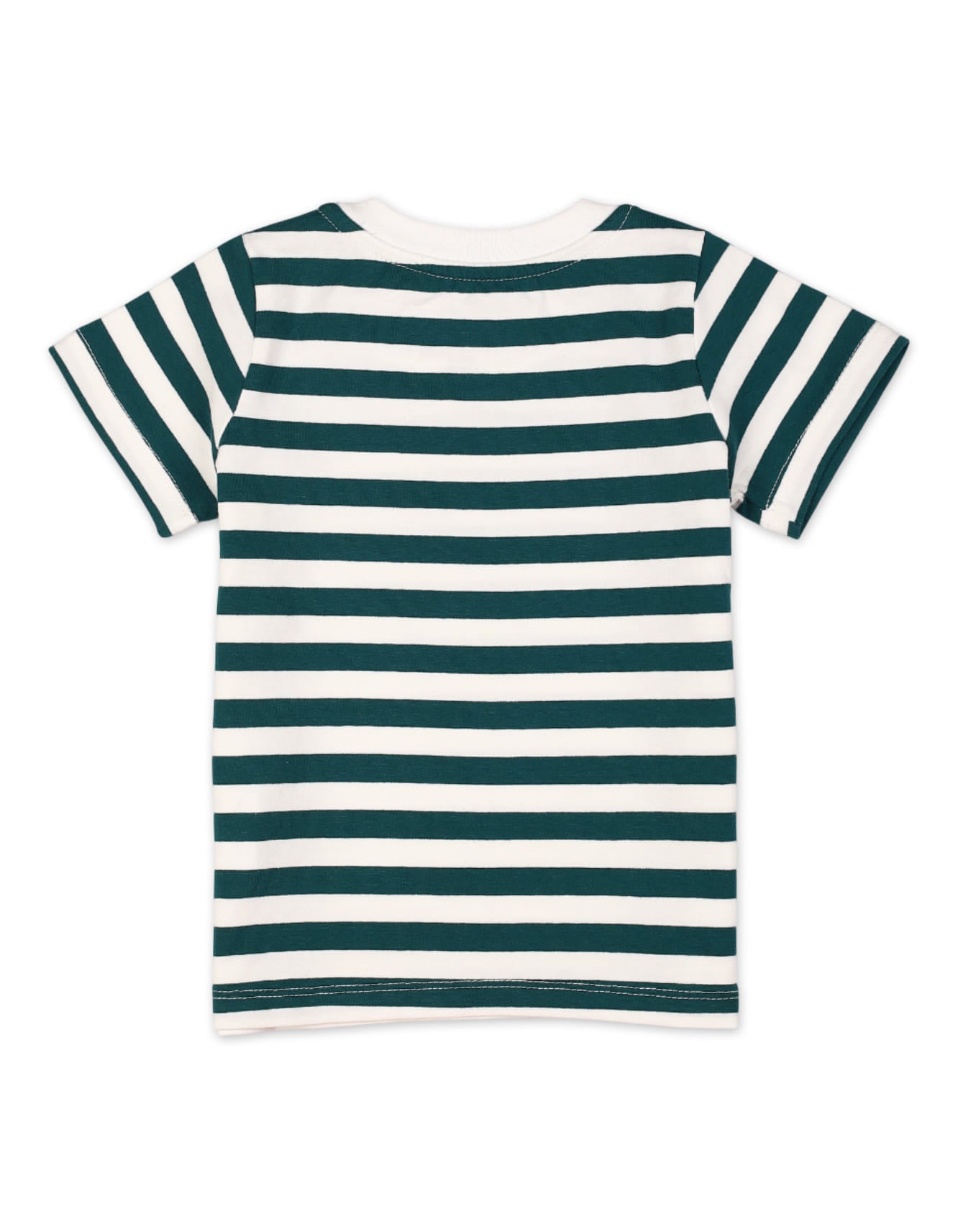 This vibrant short-sleeved t-shirt for babies is perfect for a little boy who loves big construction vehicles! The shirt is a soft, solid light green fabric, offering a fresh and cheerful look. It has a contrasting navy blue ribbed collar, adding a neat finish. On the front, there's a dynamic graphic featuring a large yellow dump truck with its bed lifted, suggesting it's actively working. Below the truck, the word "DIG" is boldly written in black capital letters with a subtle outline, adding to the construction theme.