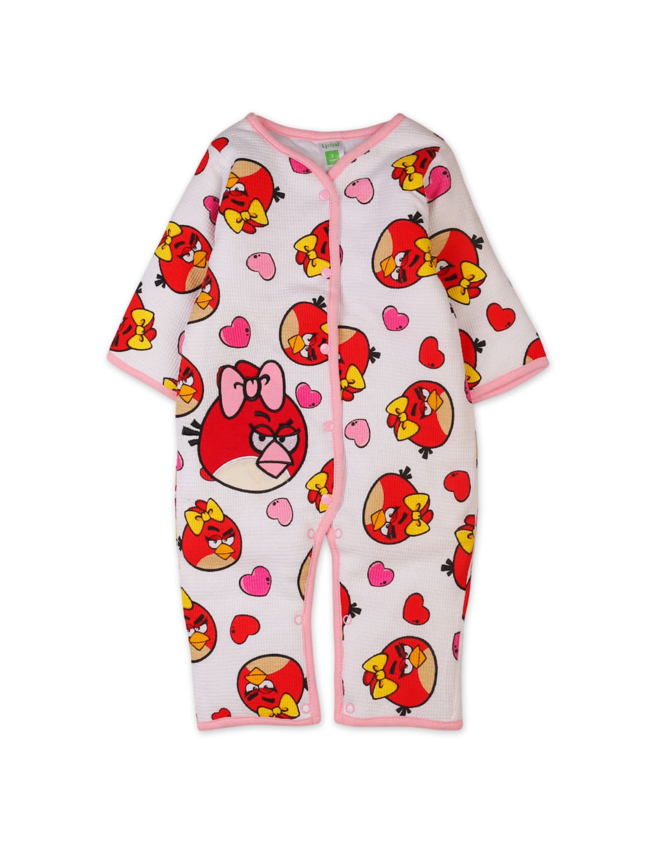 Features a colorful all-over Angry Birds character print with heart details, creating a playful and eye-catching look for baby girls.