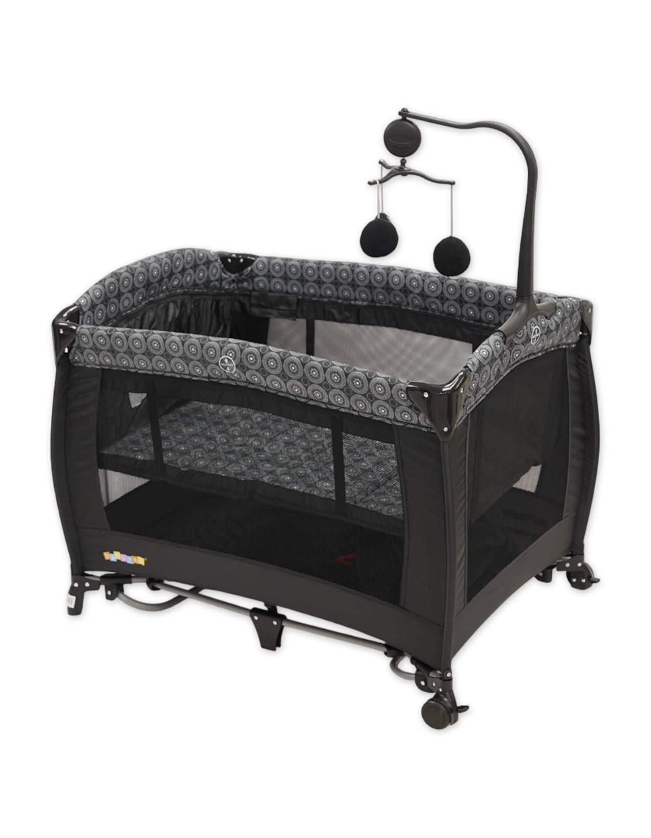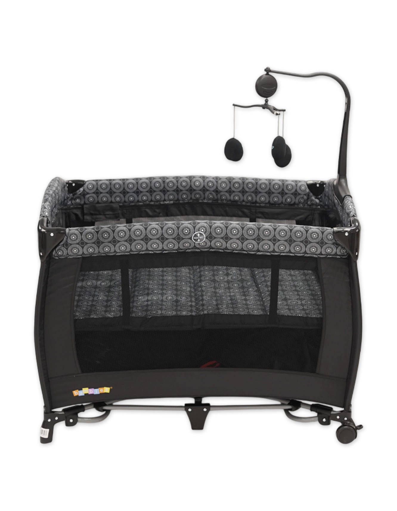 The Bambies 2-in-1 Playard in an elegant black and grey geometric print is a versatile, safe, and comfortable solution for parents looking to provide their little ones with a secure space for play and rest. Featuring a built-in rocking function, breathable mesh sides, and a soothing mobile, this playard is designed to create a calm and engaging environment for your baby.