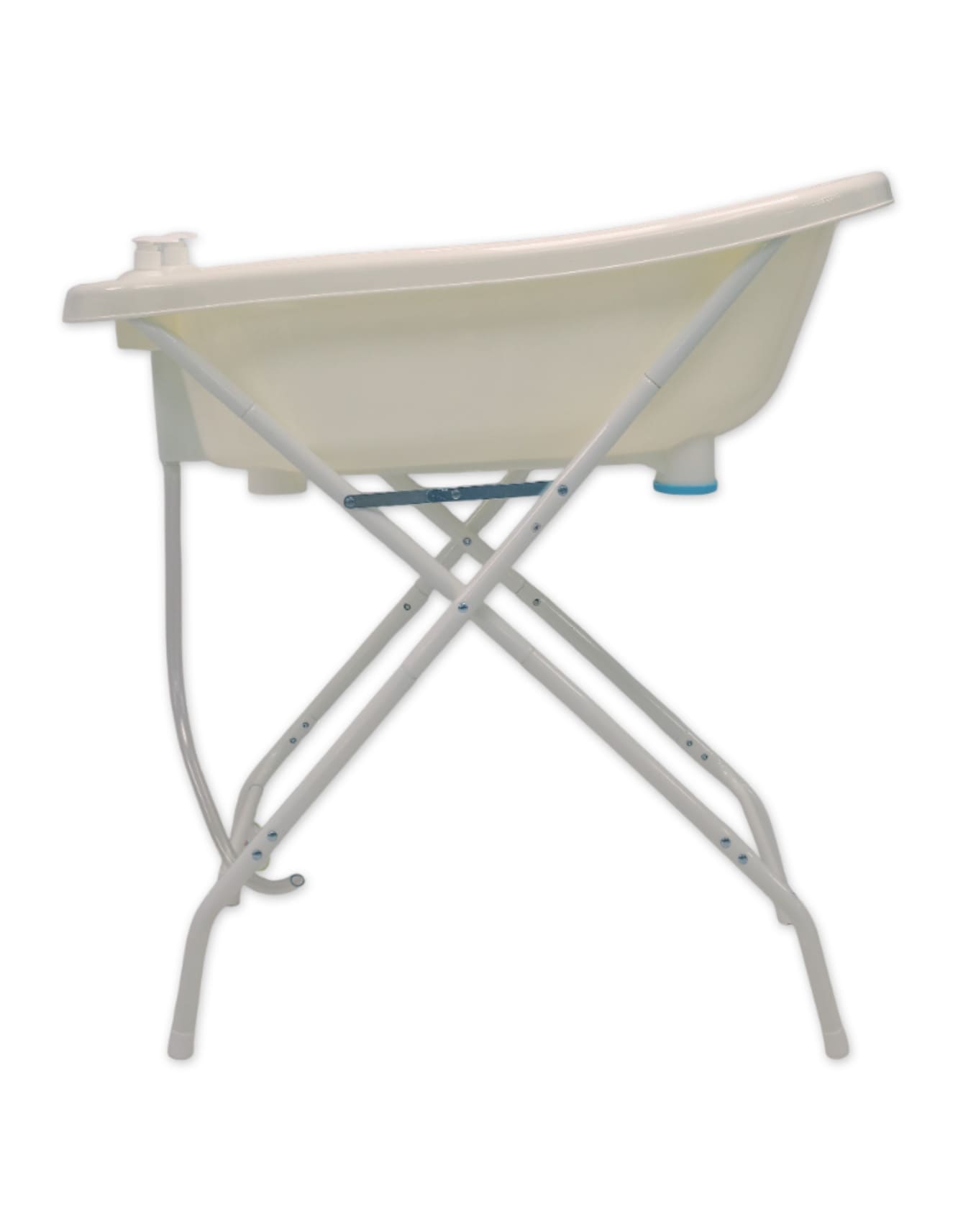 The tub sits on a stable steel stand, raising the bathing area to a comfortable height so parents don’t need to bend or kneel—especially helpful for postpartum mothers.