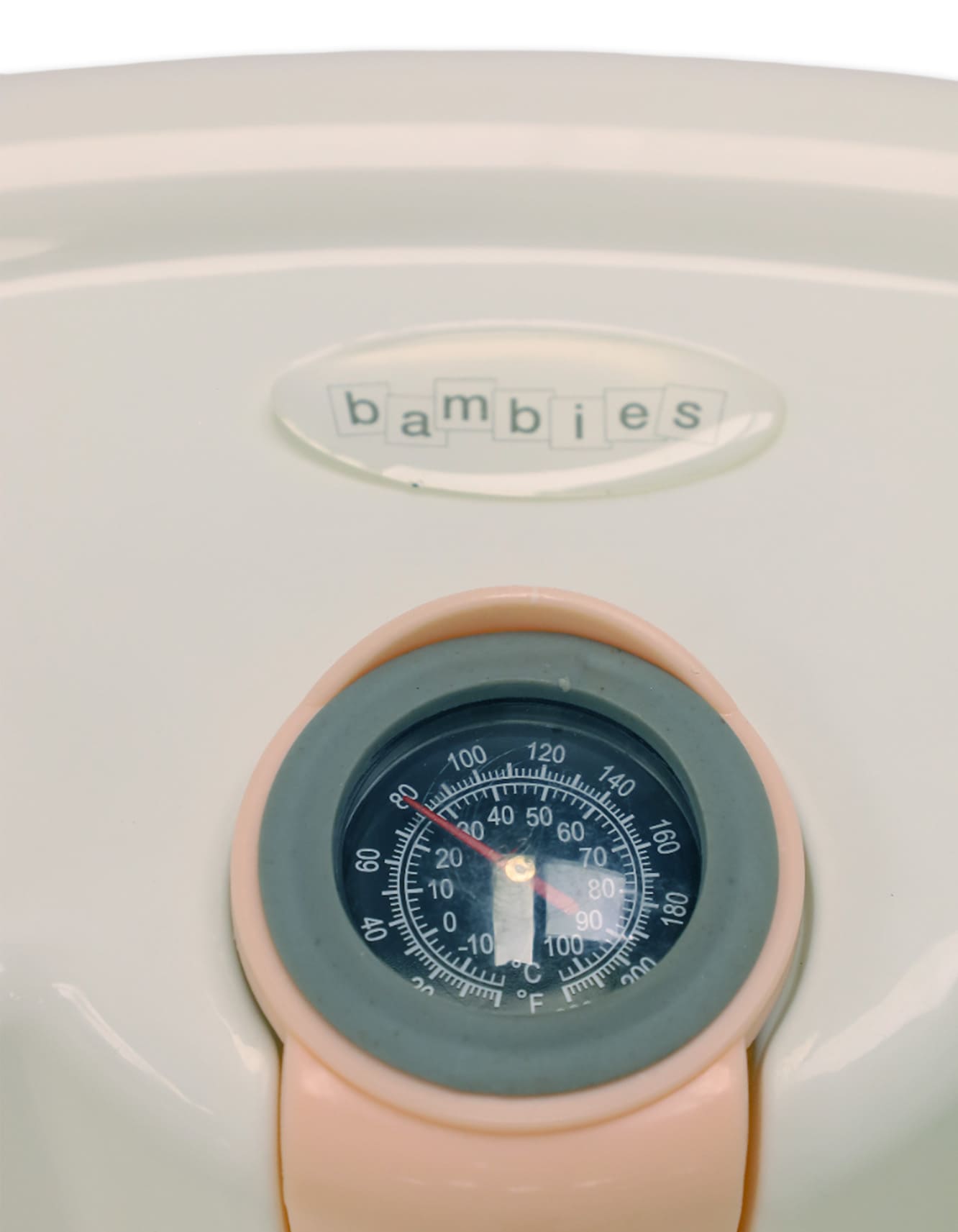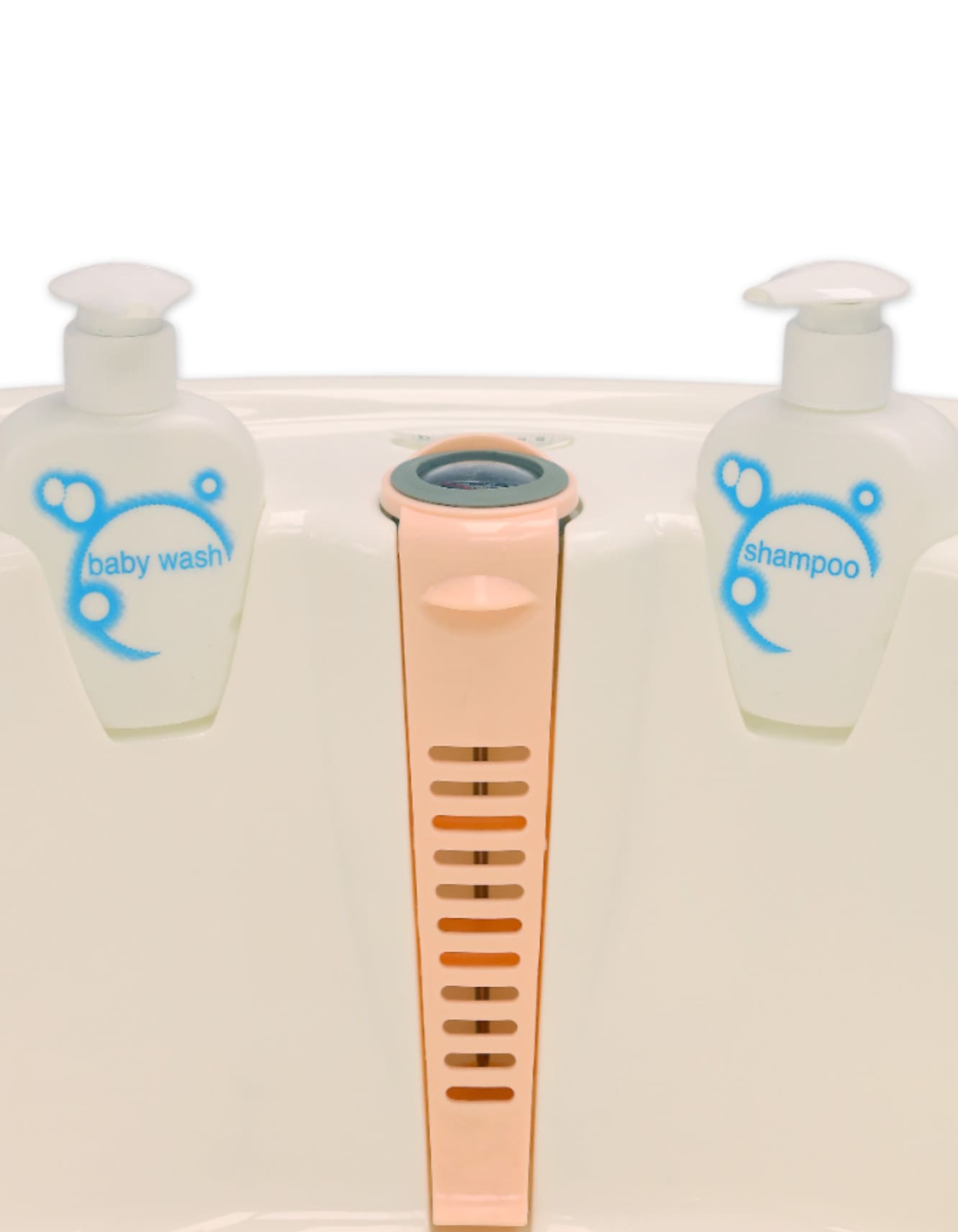 A central thermometer display allows parents to easily monitor the bathwater temperature, ensuring the water is always safe and cozy for delicate newborn skin.