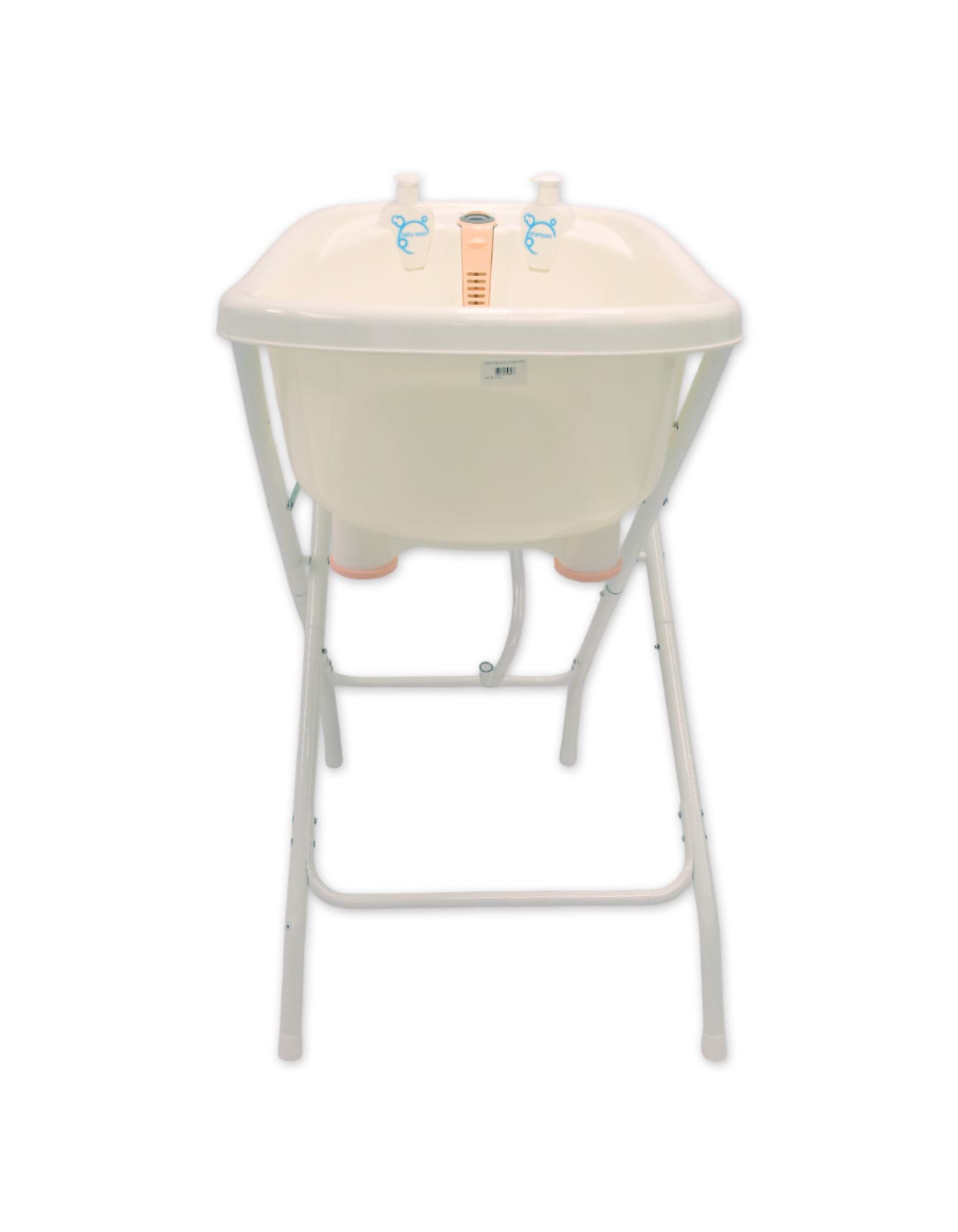 The tub sits on a sturdy steel stand that raises the bathing area to a comfortable height, eliminating the need for parents to bend or kneel—especially beneficial for postpartum mothers.