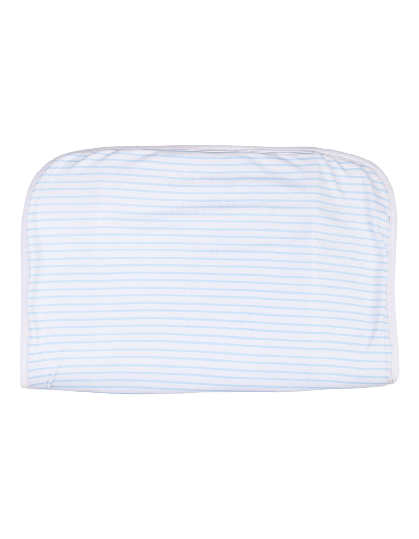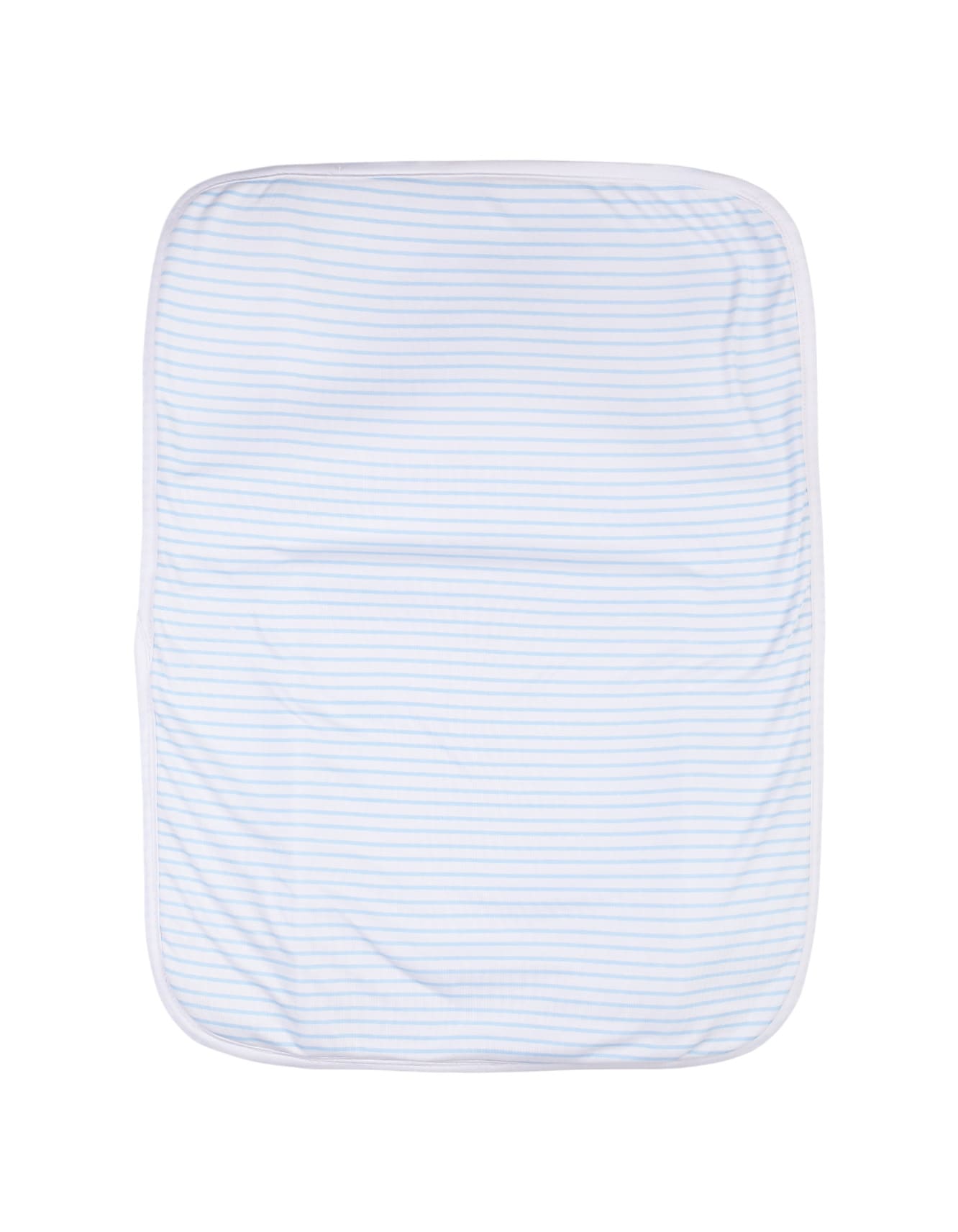 The Farmlands collection by Bambies features a timeless and serene aesthetic. This specific sheet showcases a classic light blue horizontal stripe design on a clean white base, offering a calm and refreshing look that is perfect for baby boys. The meticulous craftsmanship is visible in the smooth, rounded edges and high-quality piping, ensuring the sheet stays flat and secure on changing tables, beds, or during travel.