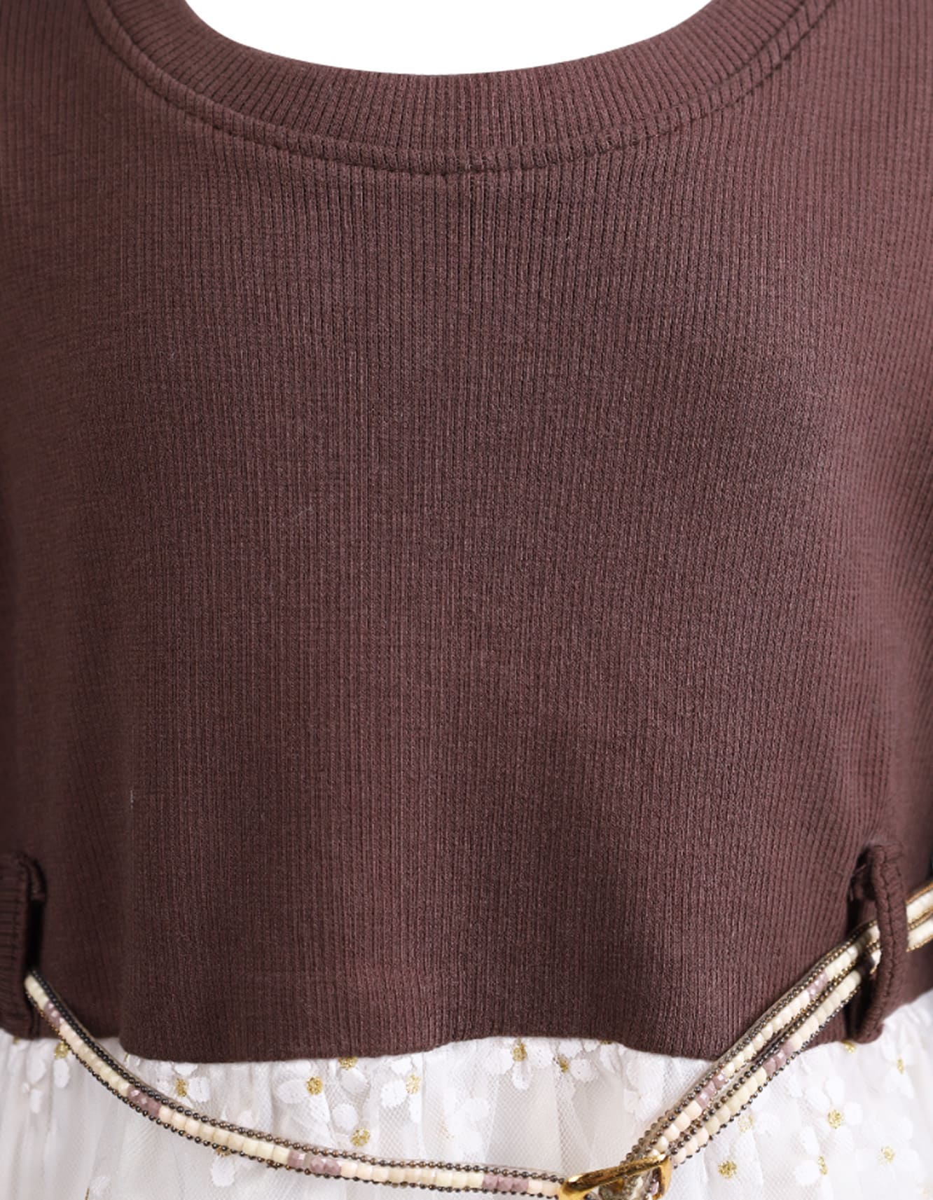 Cozy brown knit top paired with a delicate white floral mesh skirt for a graceful, modern look.