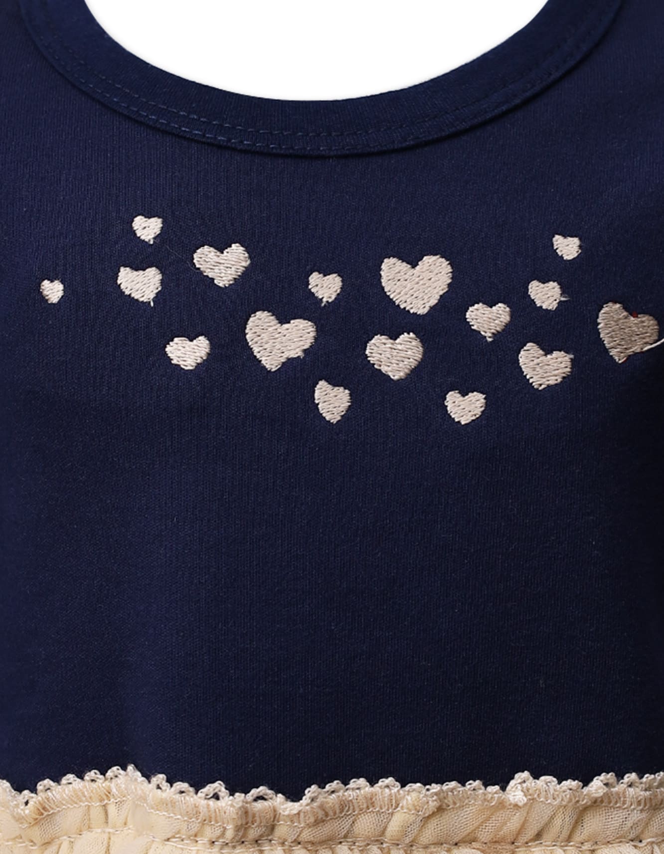 This Bambies Baby Dress combines a pure blue cotton upper with charming Beige heart motifs, adding a touch of sweetness to your little one’s outfit.