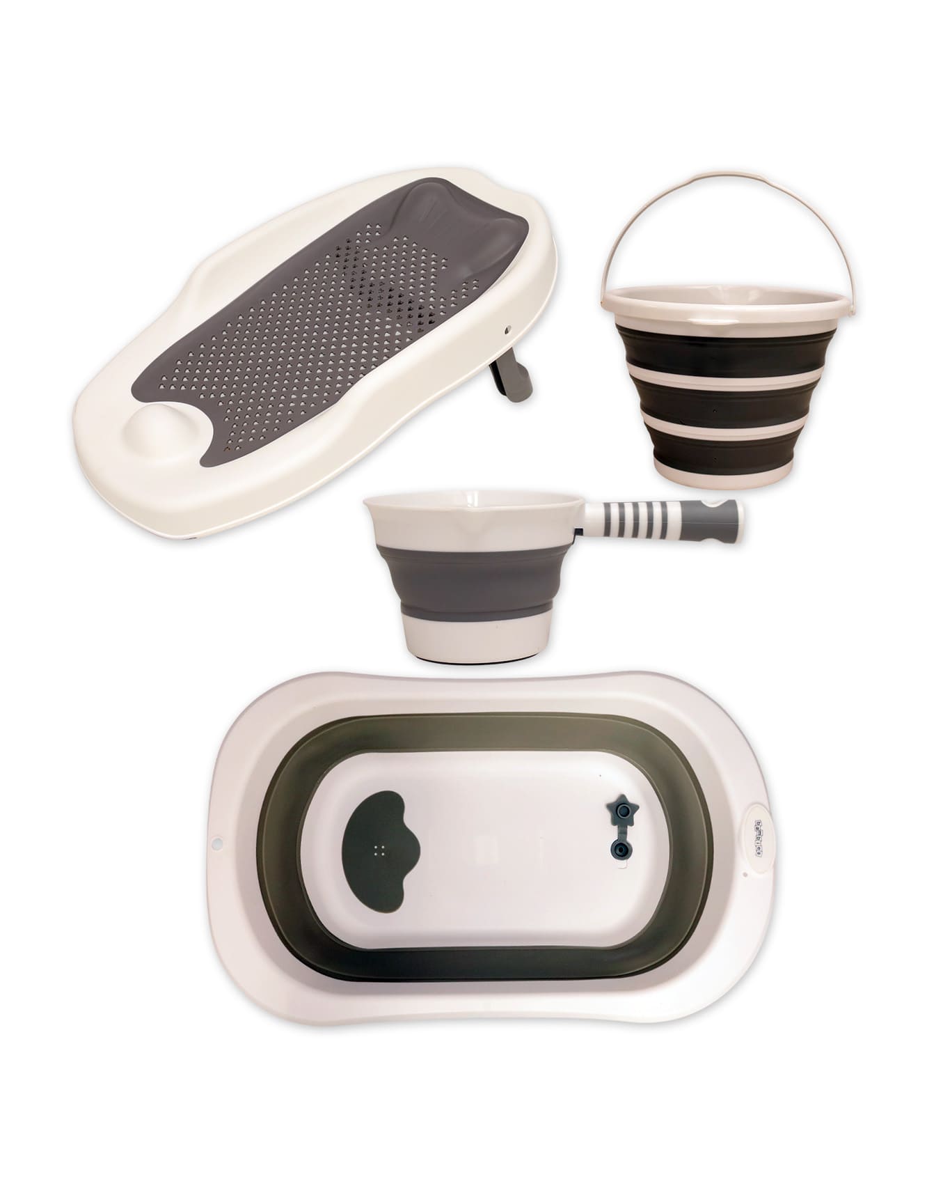 Featuring a foldable baby bathtub, foldable stand, ergonomic newborn bath support, collapsible bucket (White and Grey), and a water-pouring scoop (White and Grey), this complete set provides everything parents in Pakistan need for stress-free, organized, and efficient baby bath time.