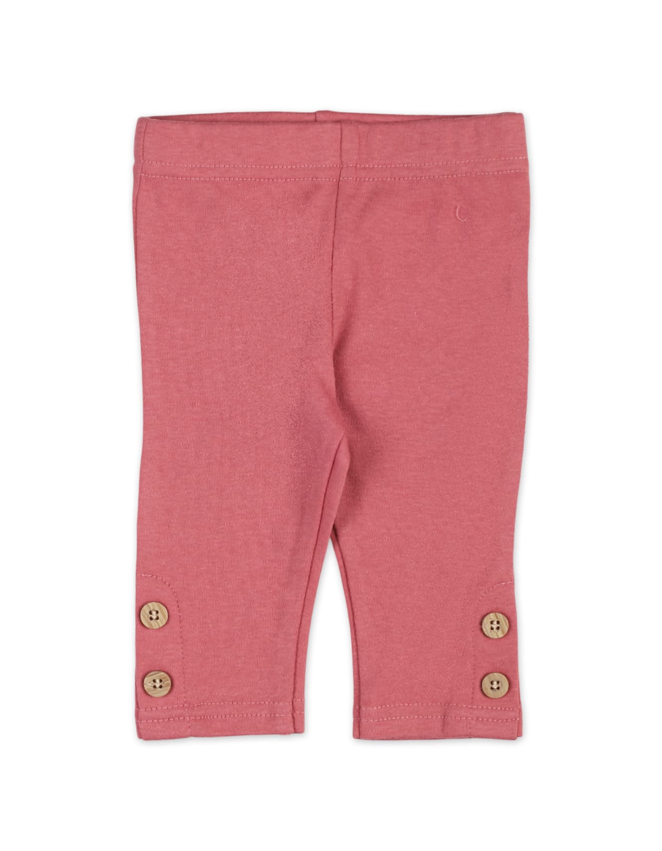 Pink leggings with a flexible waistband and decorative wooden style buttons for a sweet, modern finishing touch.
