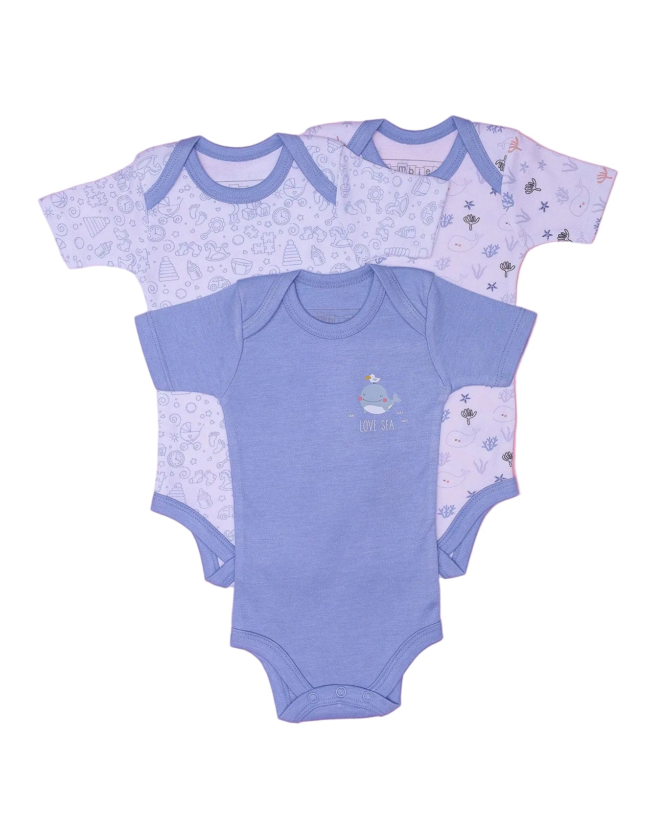 Three-Piece Value Pack Includes three short-sleeve bodysuits with coordinating patterns in blue and white themes.