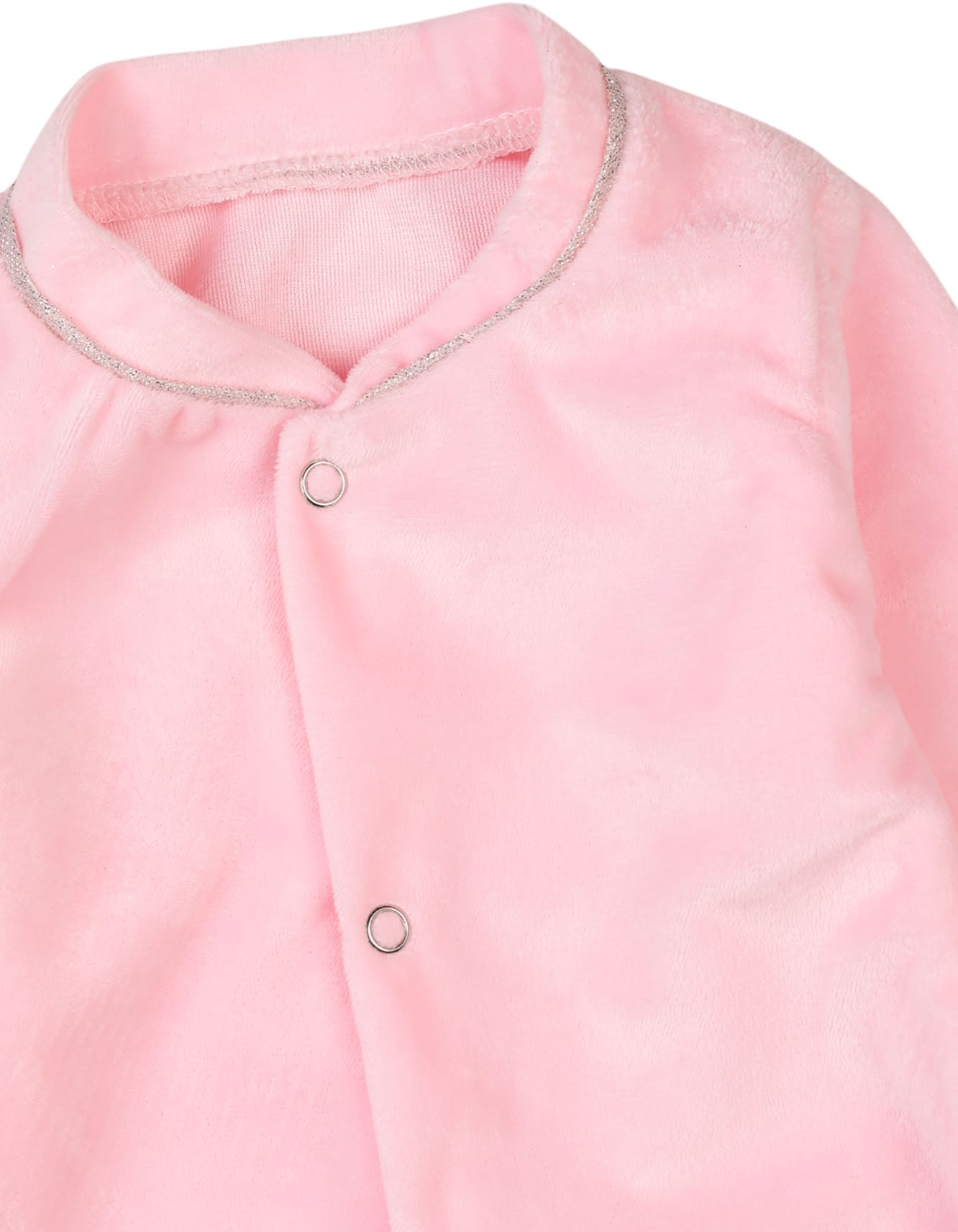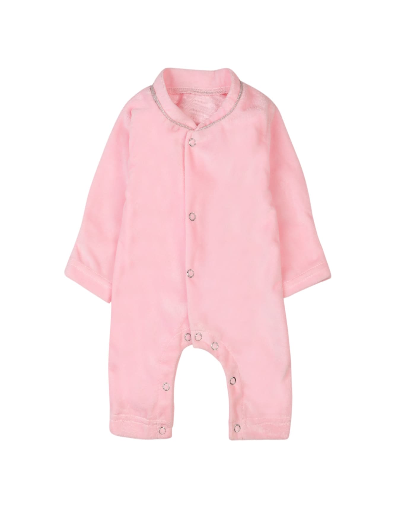 Pink full-sleeve romper with front snap-button closure for easy dressing and diaper changes. Designed for warmth and all-day comfort.