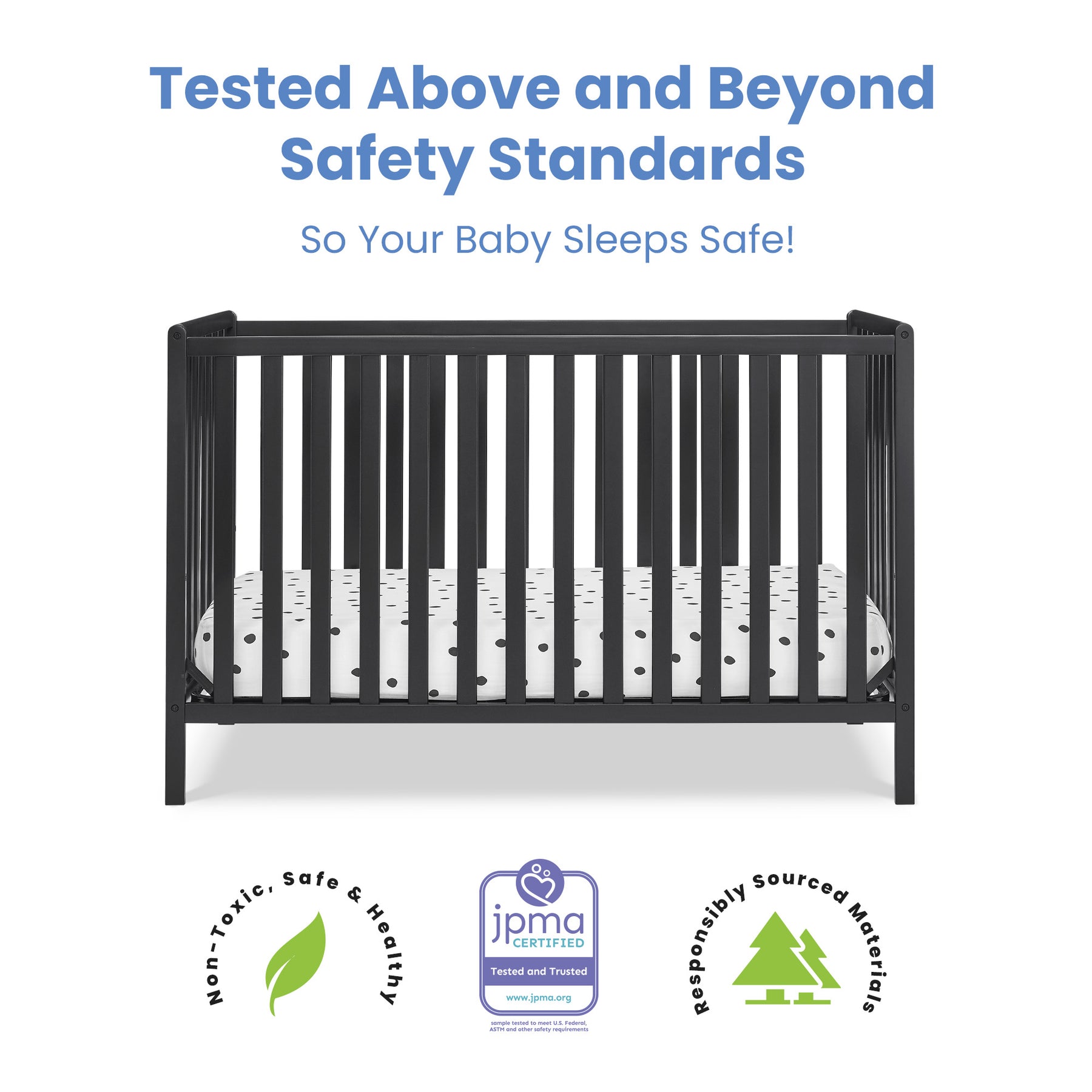 This crib is JPMA certified to meet or exceed all safety standards set by the CPSC & ASTM