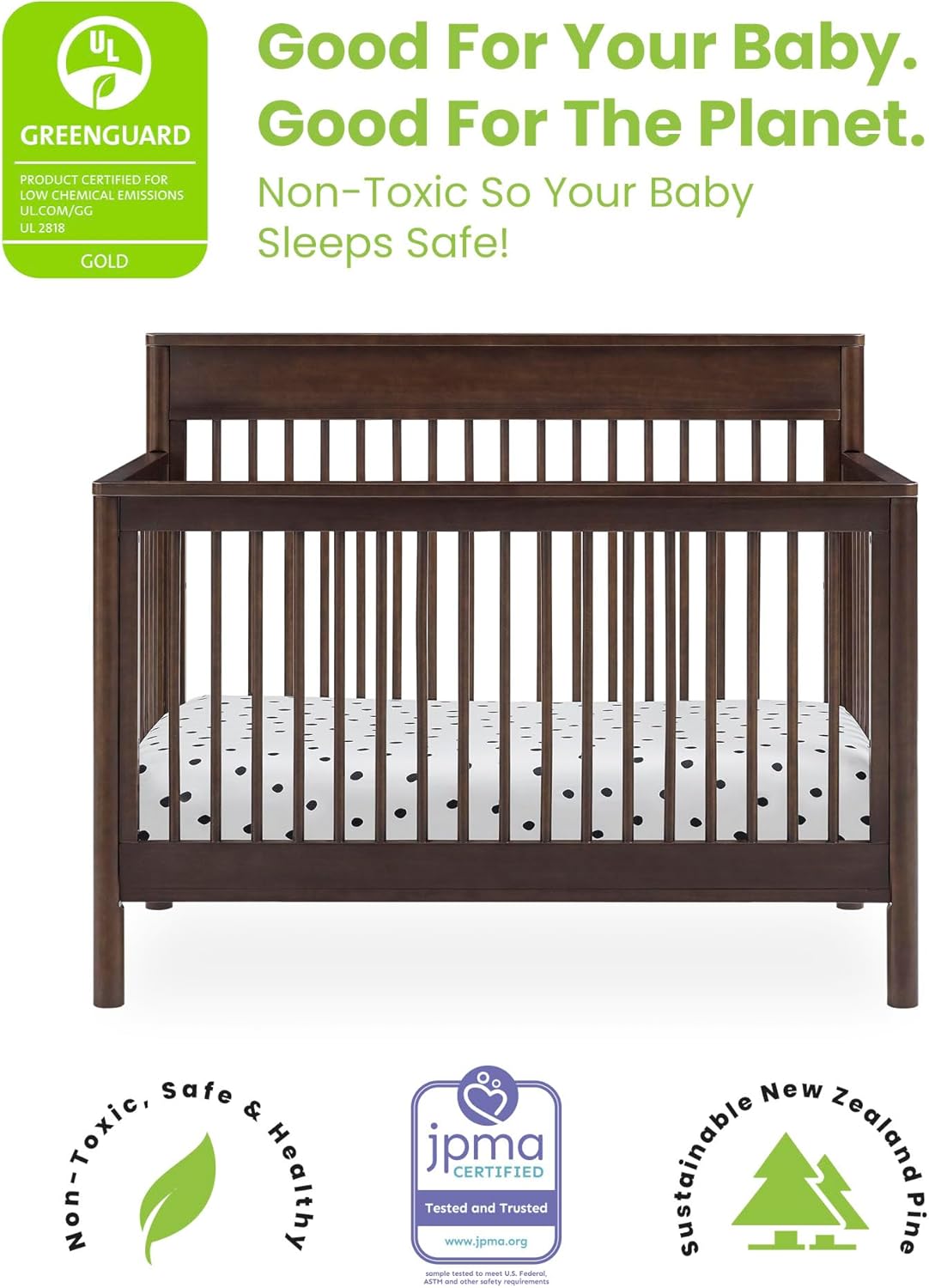 • This crib is GREENGUARD Gold Certified, meaning it meets or exceeds stringent chemical emissions standards