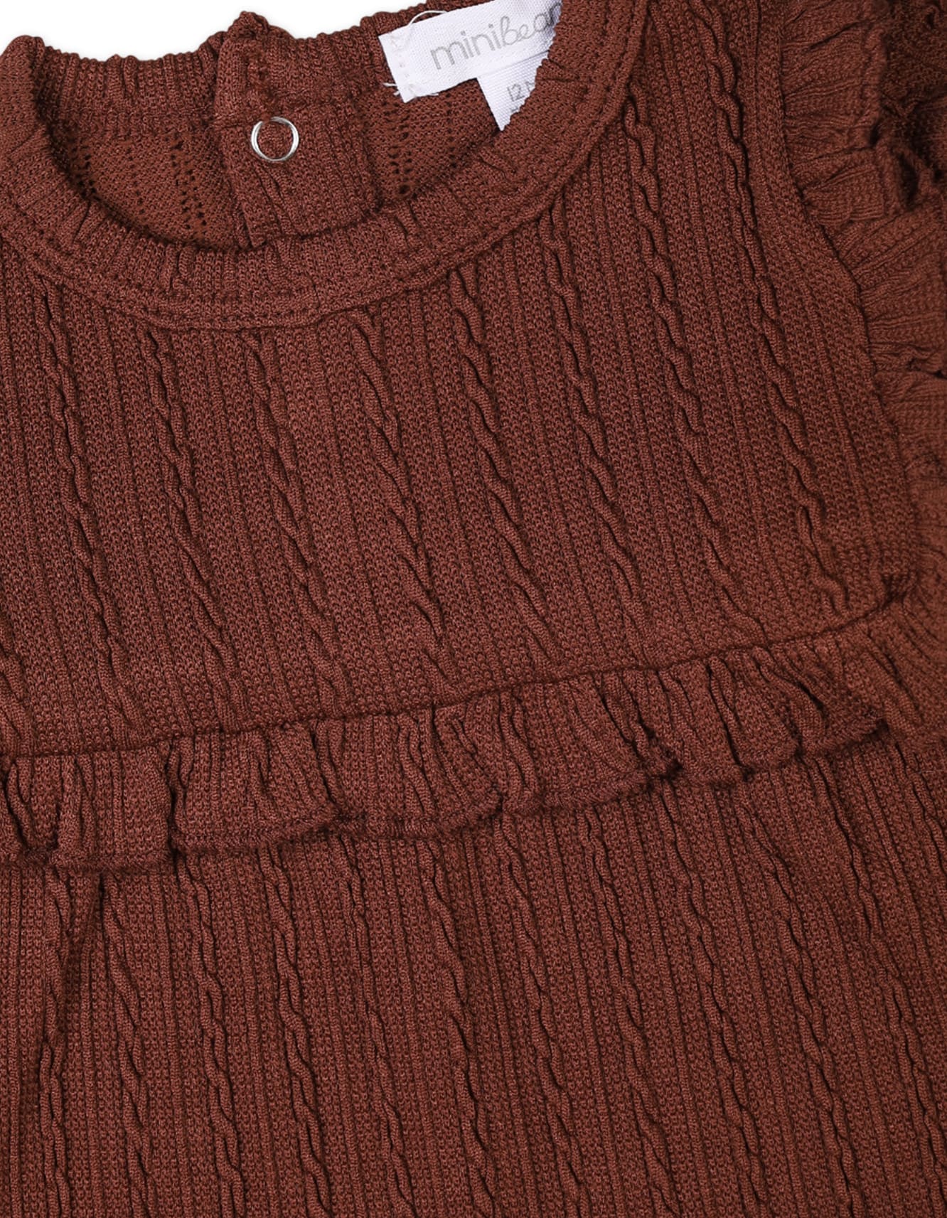 Crafted with Bambies’ signature commitment to quality, the brown ribbed top features delicate ruffle details and a gently gathered silhouette that adds charm and comfort. The matching ribbed leggings provide a snug yet flexible fit, making them perfect for everyday wear. The bow headband gives the outfit a coordinated finish, while the faux-fur vest adds warmth, luxury, and a stylish pop with its leopard-print design and cute front bows.