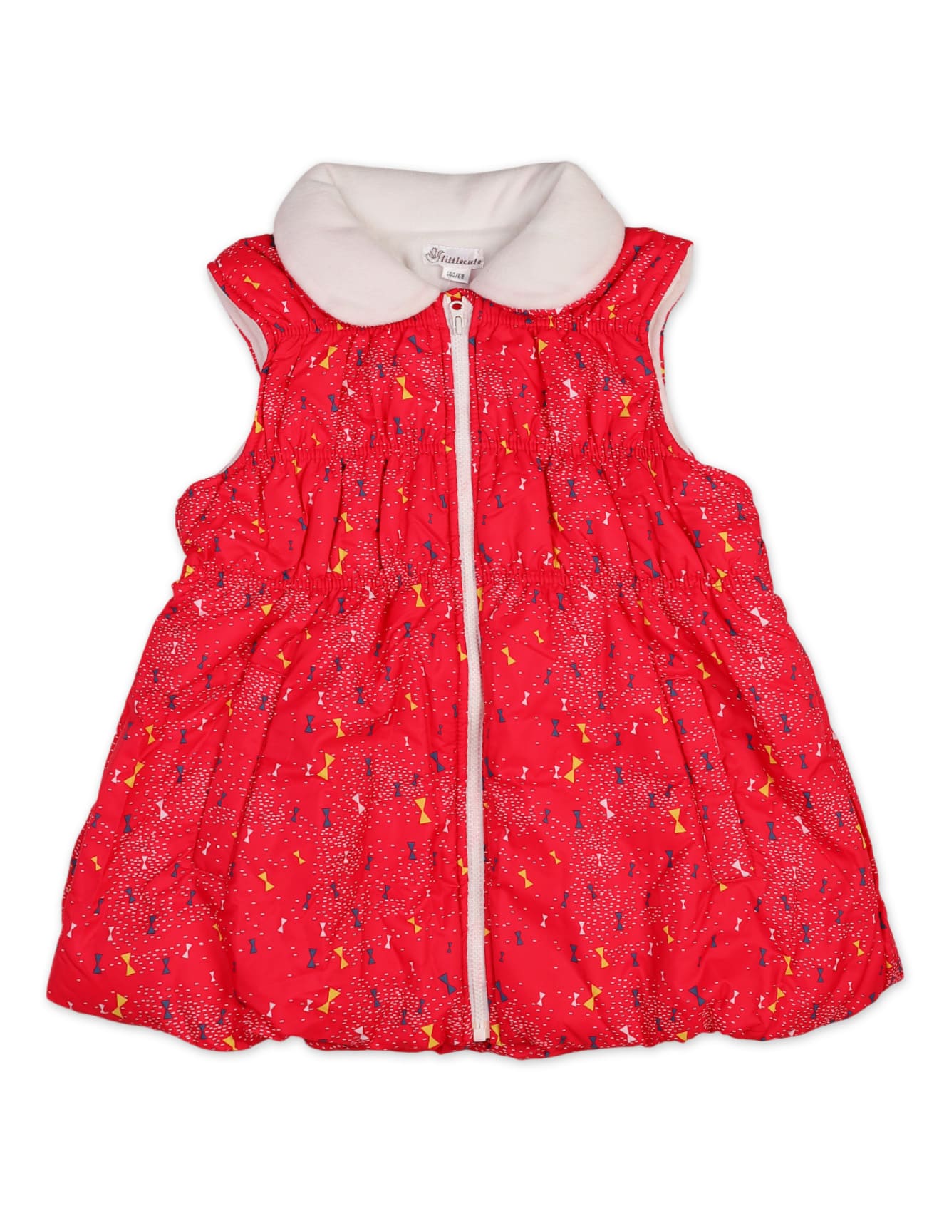 The sleeveless design is perfect for layering over tops or sweaters, while the lightweight padding provides warmth without the bulk. The vibrant red color with a playful all-over printed pattern and soft white collar adds a cheerful touch, while the front zipper ensures quick and easy dressing.