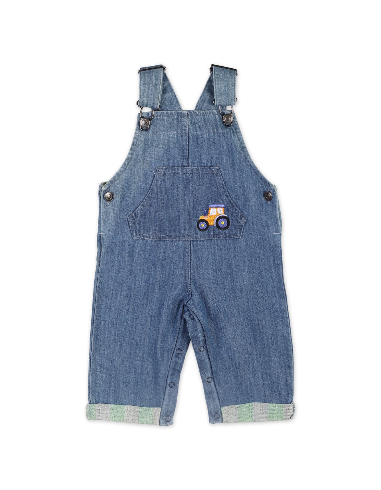 The dungaree includes adjustable shoulder straps, side button closures, and bottom snap buttons for hassle-free dressing and diaper changing.