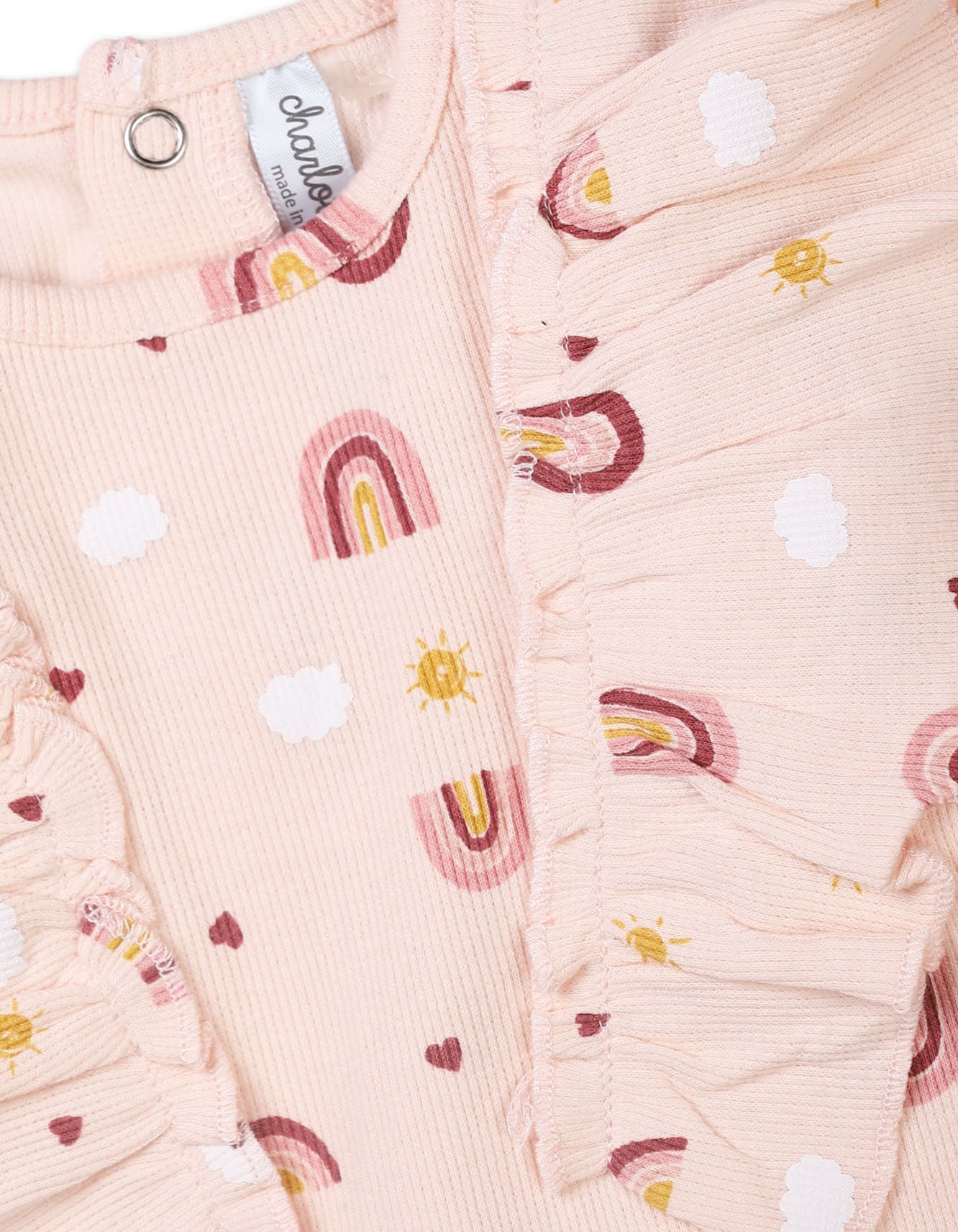 ✔ Soft pink romper with rainbow, cloud and sun all-over print