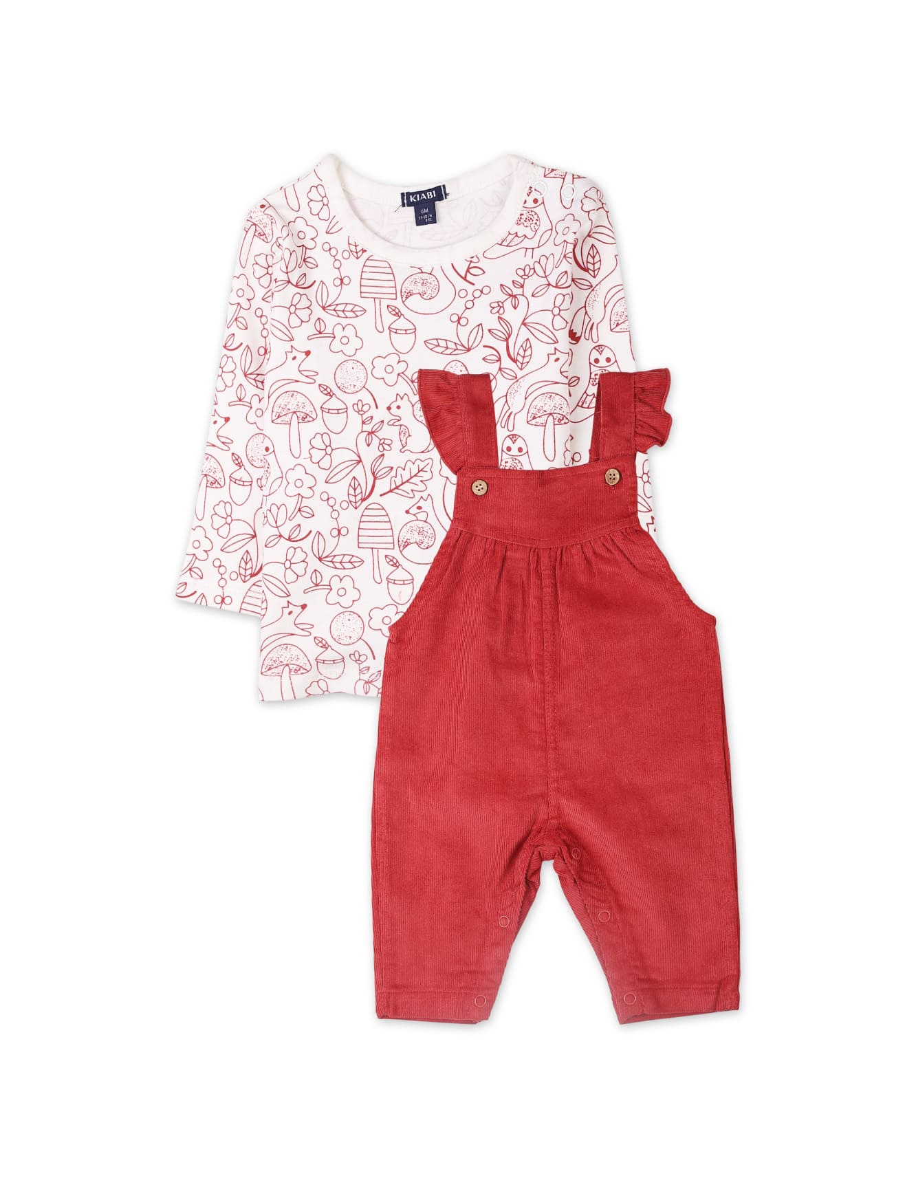 This delightful 2-piece winter suit set features a cream full-sleeve top decorated with an all-over woodland-themed print, including mushrooms, flowers, acorns, and cute forest elements in a soft red tone. Paired with a beautiful red corduroy dungaree, complete with ruffled straps and snap-button closures, this ensemble blends comfort with everyday elegance. The warm, textured corduroy fabric provides excellent insulation for cold-weather outings while maintaining the flexibility babies need.