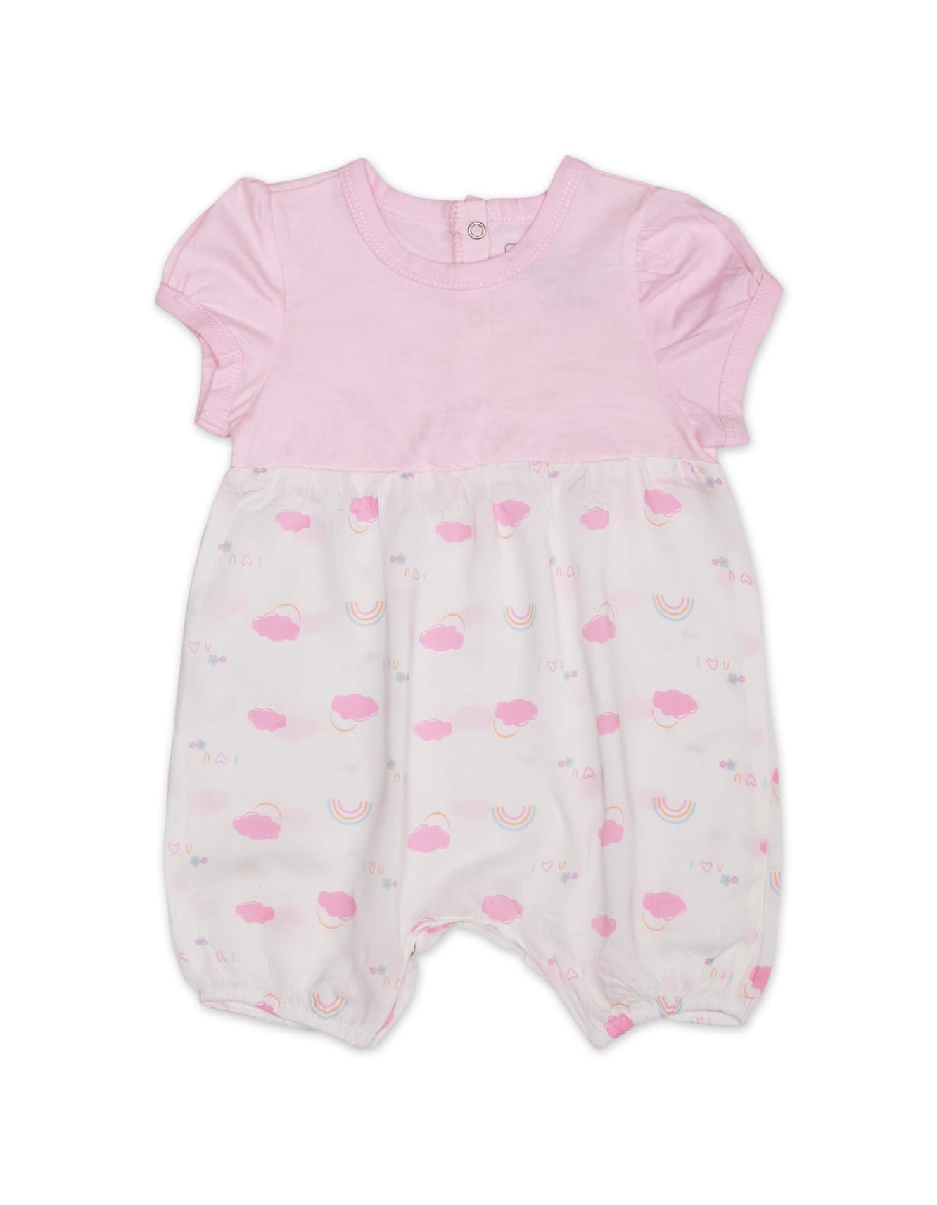 Dress your little one in ultimate comfort with this charming baby romper! Featuring a soft pastel pink bodice and a delightful cloud-and-rainbow printed bottom, this romper is perfect for everyday wear. The short puff sleeves add a touch of sweetness, while the back and bottom snap closures make dressing and diaper changes effortless.