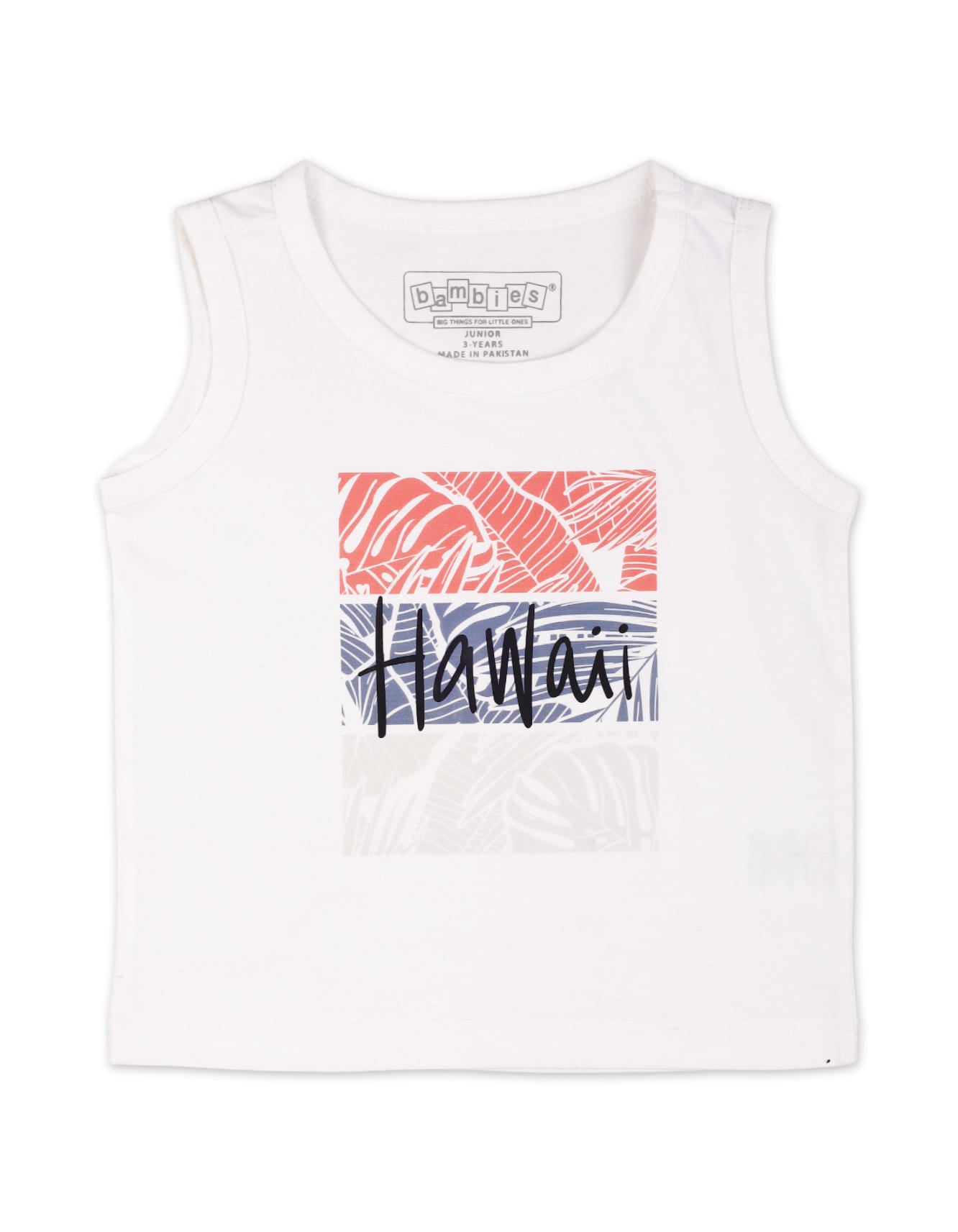 - Hawaii Graphic Sando: A crisp white sleeveless tank top (sando) with a distressed "Hawaii" graphic in a rectangular block of coral, blue, and white, evoking a relaxed, island vibe.