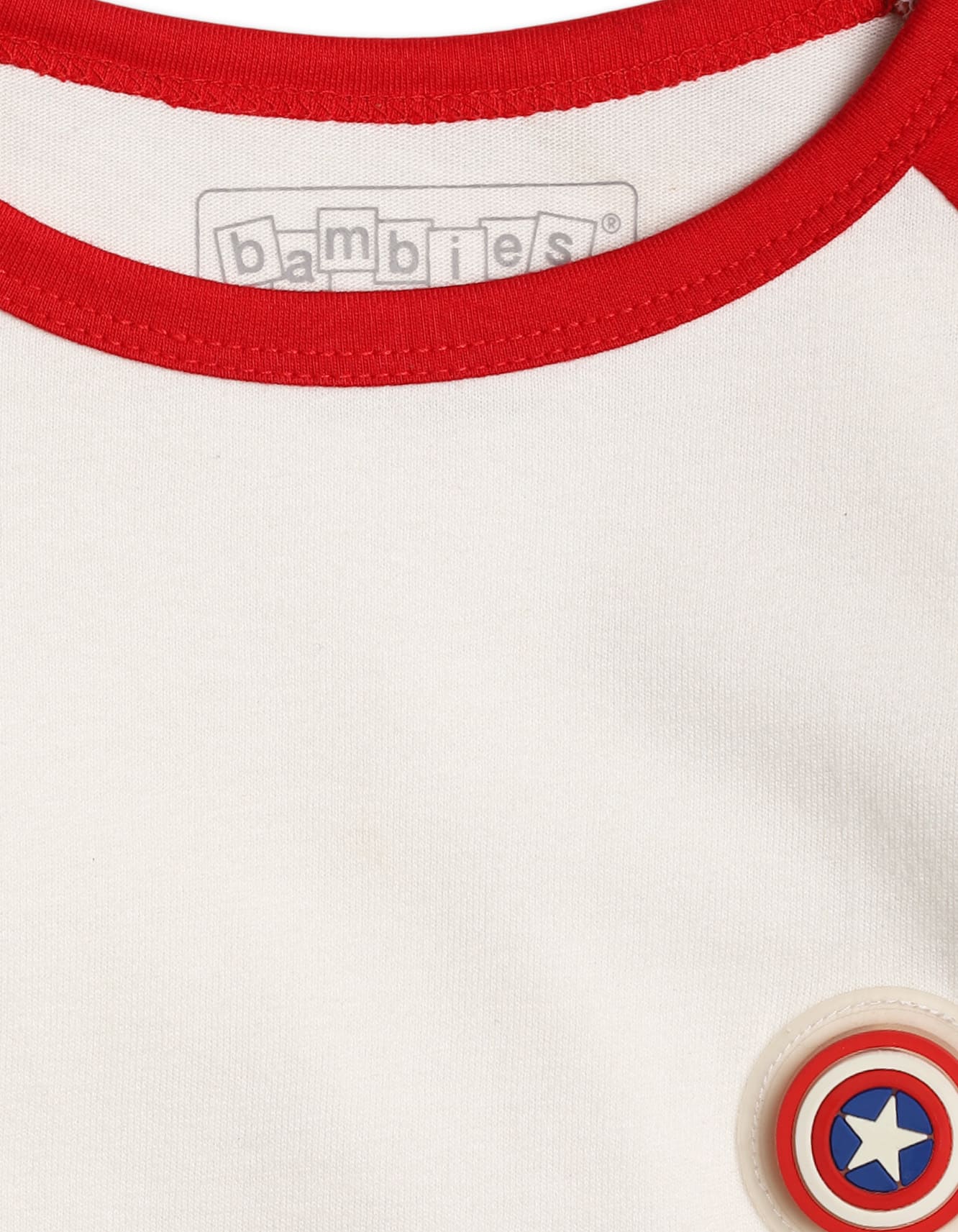 This boys’ full-sleeve T-shirt features a modern raglan design with contrasting red-colored sleeves, accented by double white sporty shoulder stripes that enhance its athletic look. The classic white body includes an embroidered Avenger badge on the chest, adding a fun, playful touch for little sports lovers.