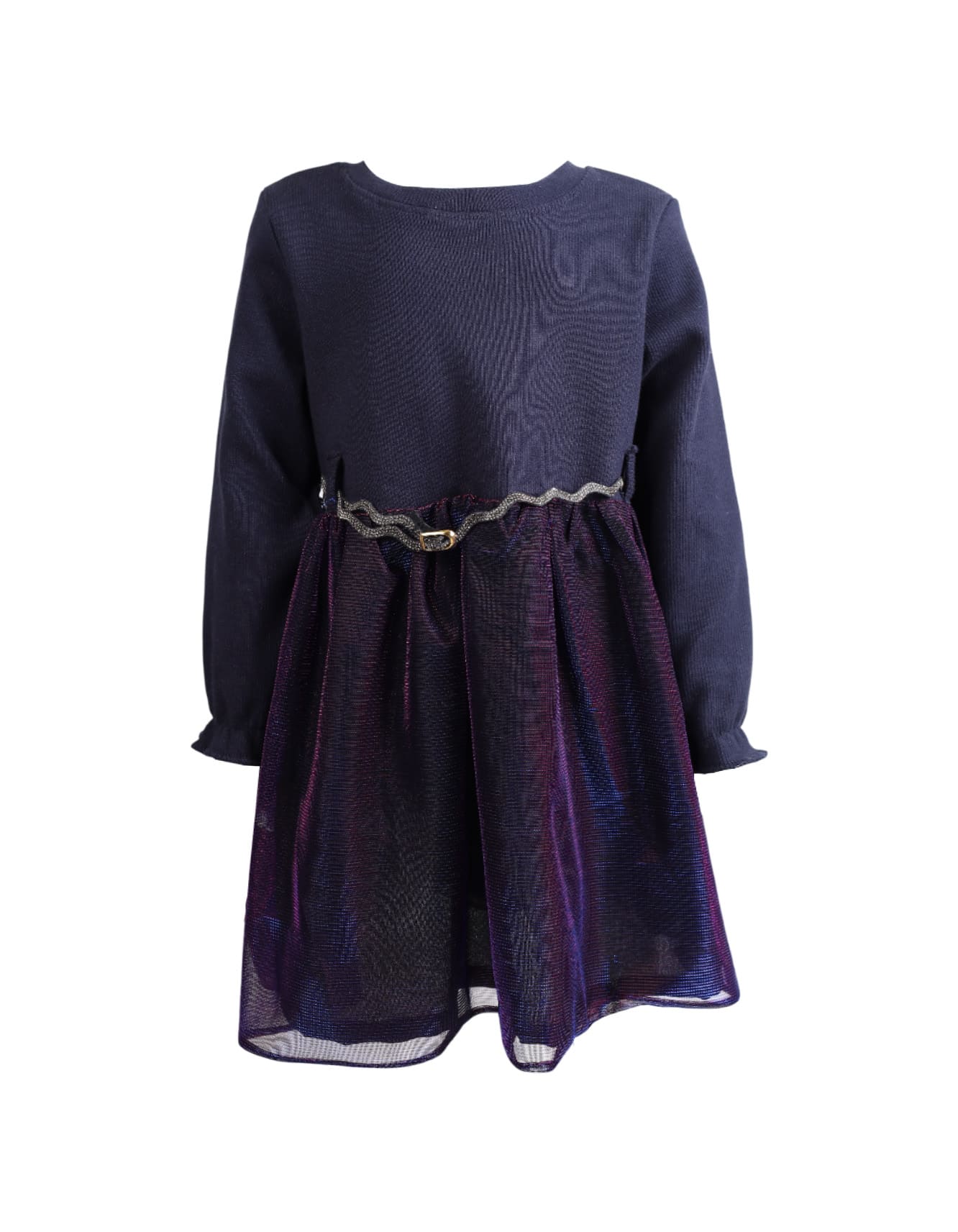 The top portion features a warm, full sleeve knit bodice in deep navy, perfect for chilly days, school functions, indoor events, and evening gatherings. The skirt flows into a magical navy purple mesh overlay with a subtle iridescent shine that catches the light beautifully, creating a graceful and eye catching look that young girls love. Completing the outfit is a slim decorative belt at the waist that adds a stylish, polished touch to the overall silhouette.