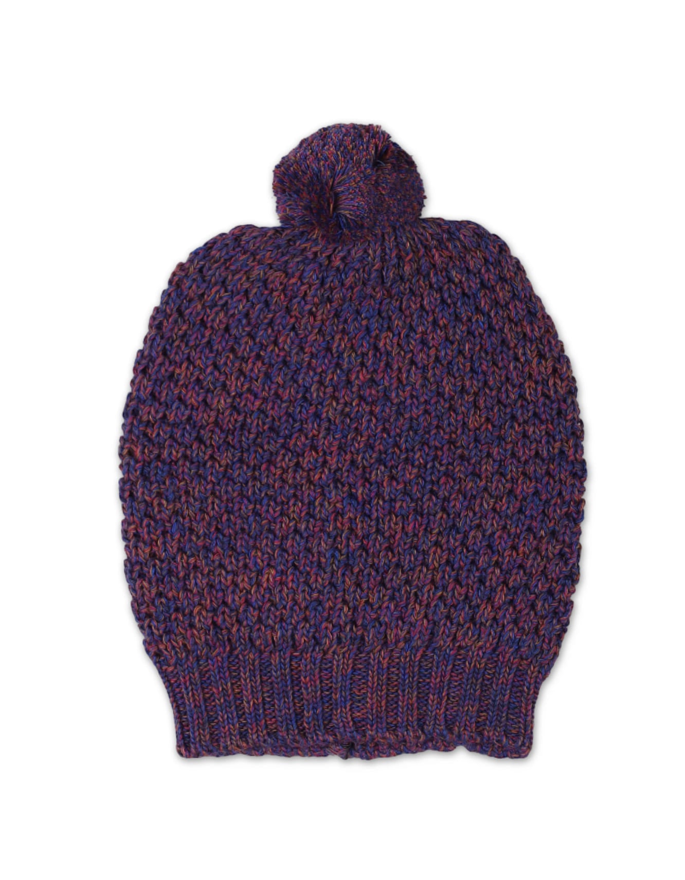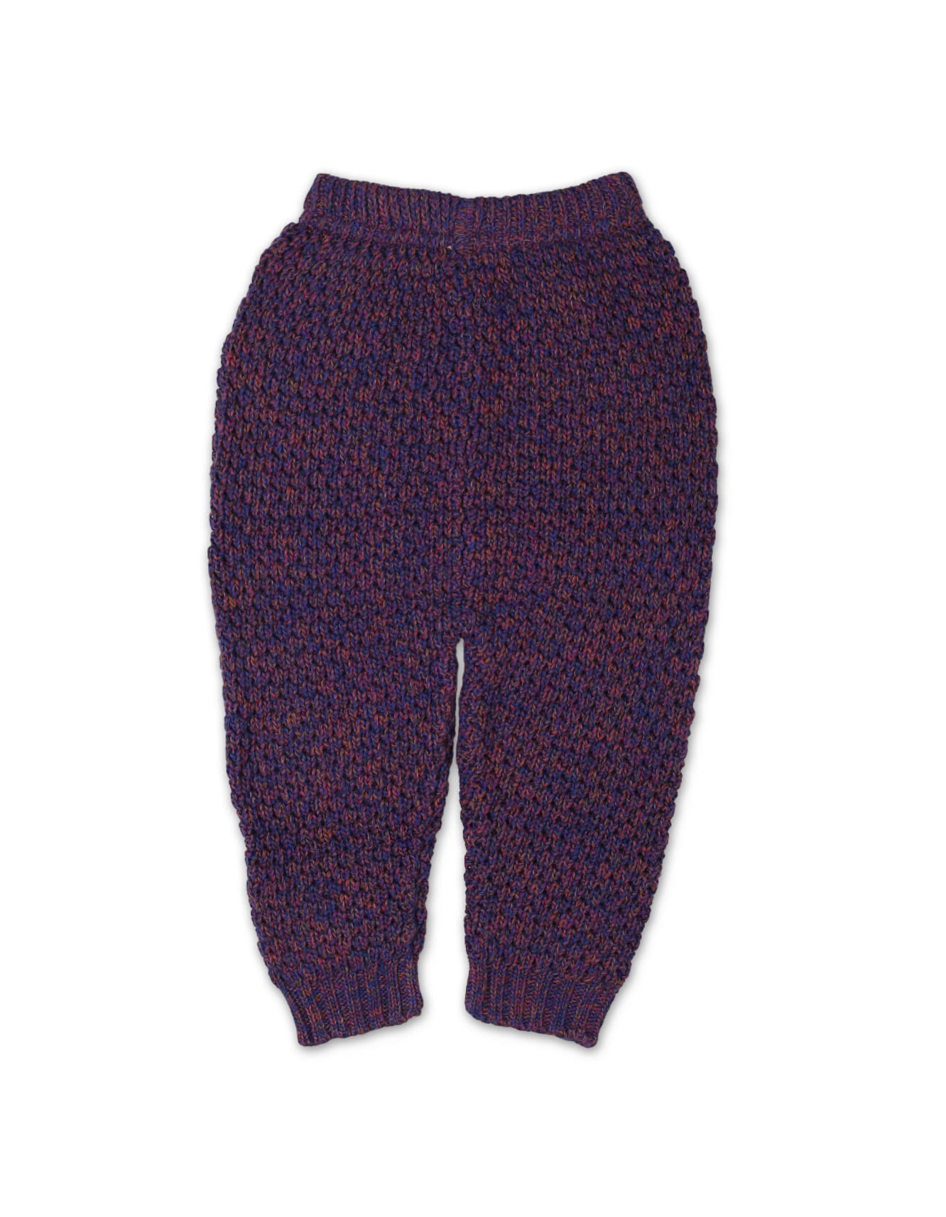 This striking set is crafted from a soft, thick yarn featuring a rich melange knit texture—a beautiful blend of deep purple/indigo and rustic red/maroon threads. This textured, chunky knit provides excellent insulation. The set includes a classic crew-neck pullover, comfortable pull-on trousers, and a matching knitted hat with a subtle top knot or pom-pom feature.
