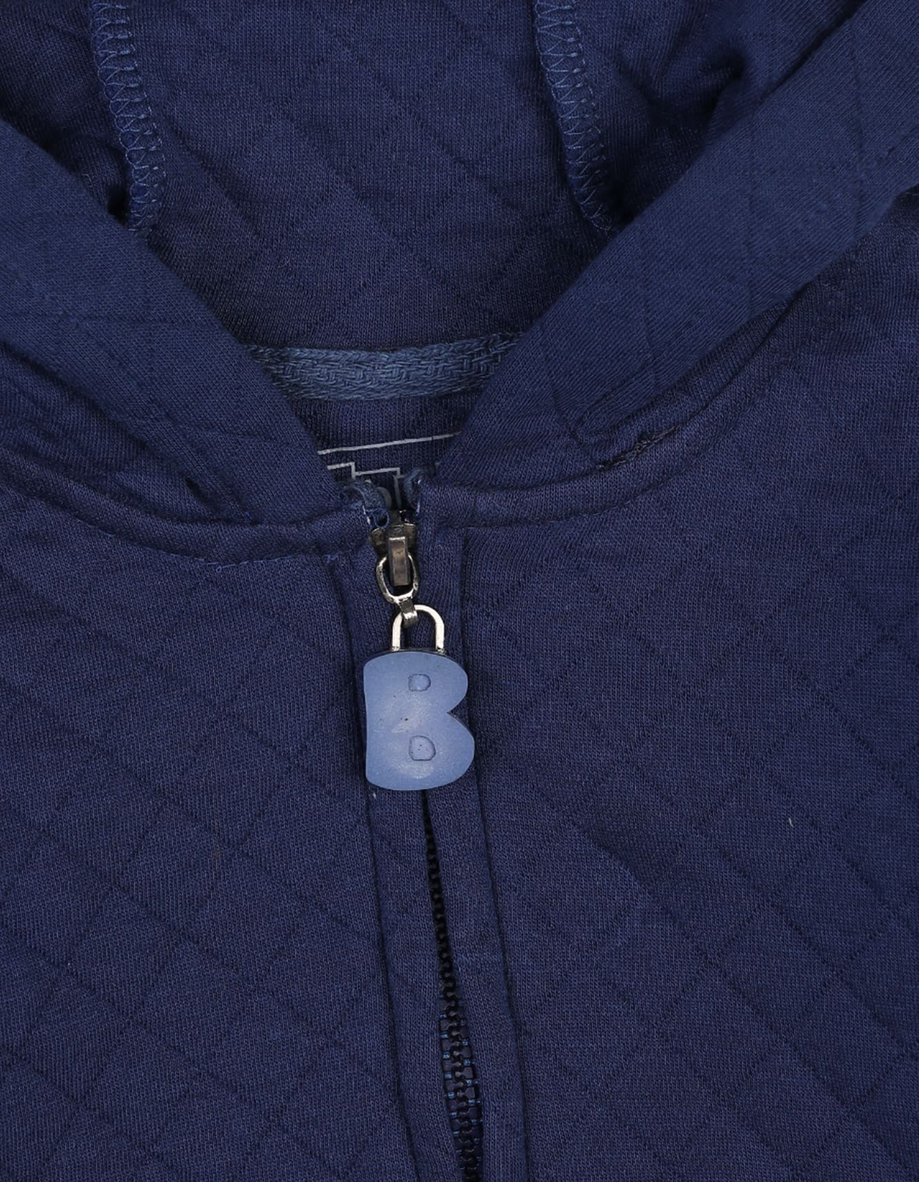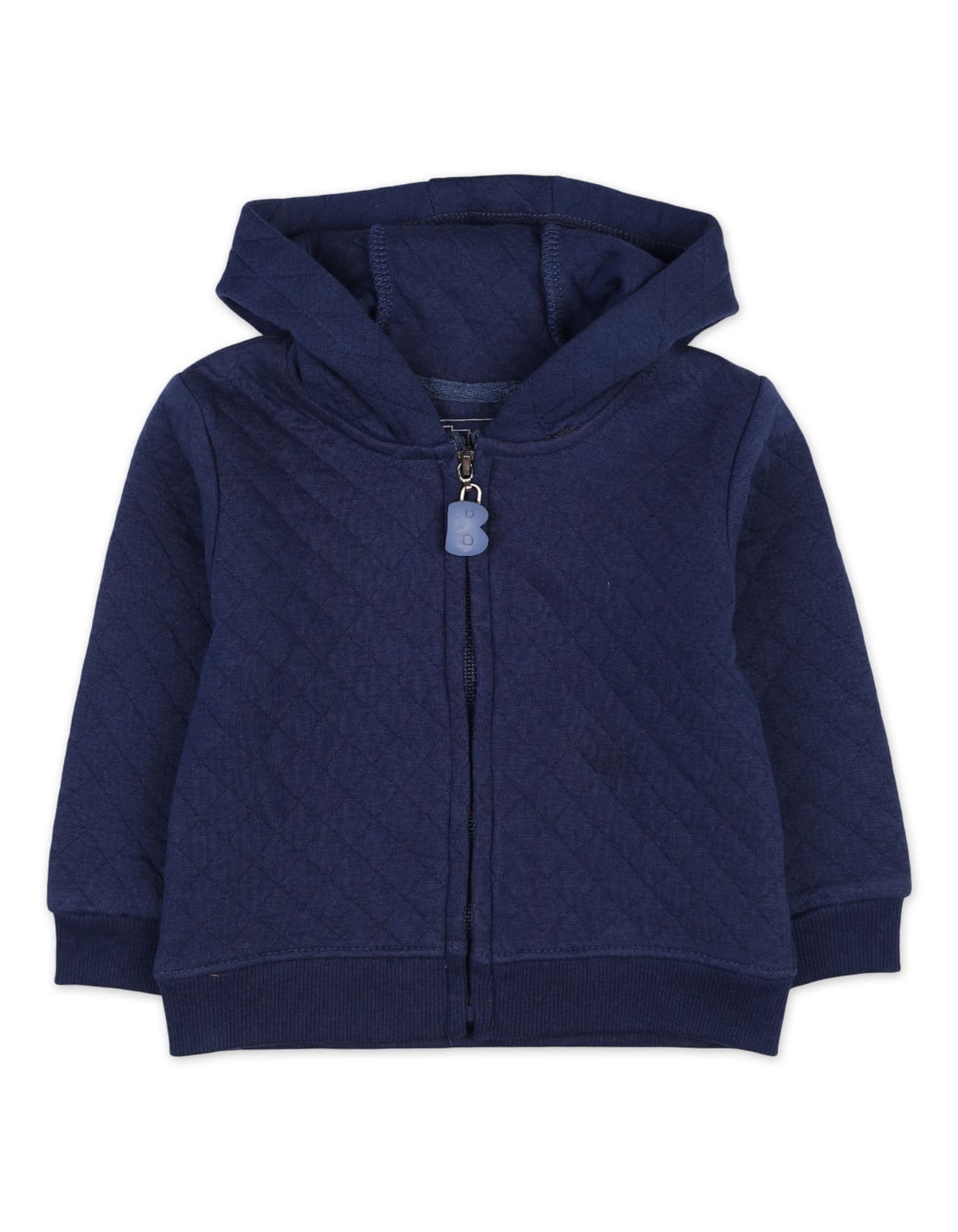 1. A navy quilted hooded jacket for cozy warmth.