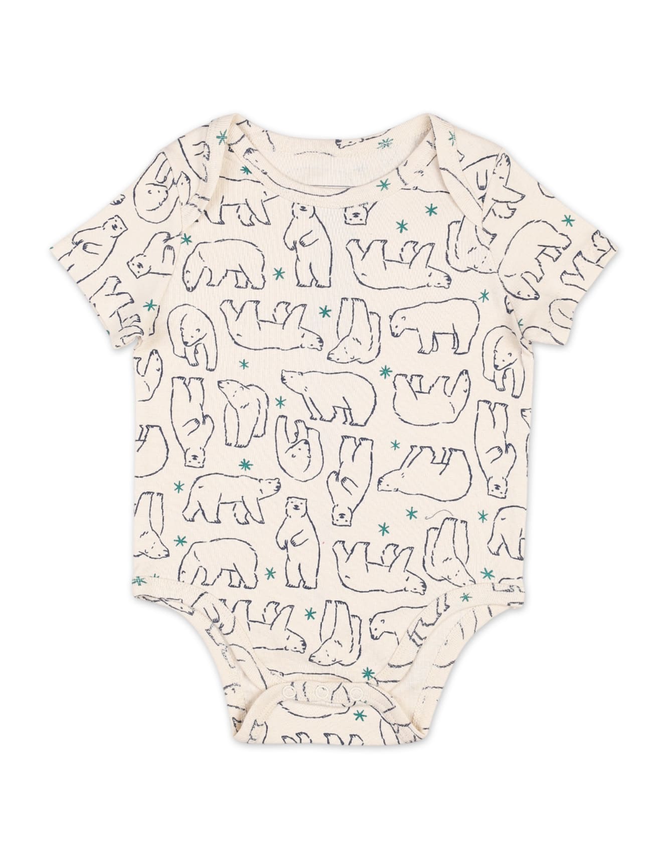 The set includes a zip-up navy hoodie for warmth, matching jogger pants with a snug elastic waistband, and an adorable short-sleeve printed bodysuit featuring playful polar bear illustrations — making it the perfect blend of functionality and charm.