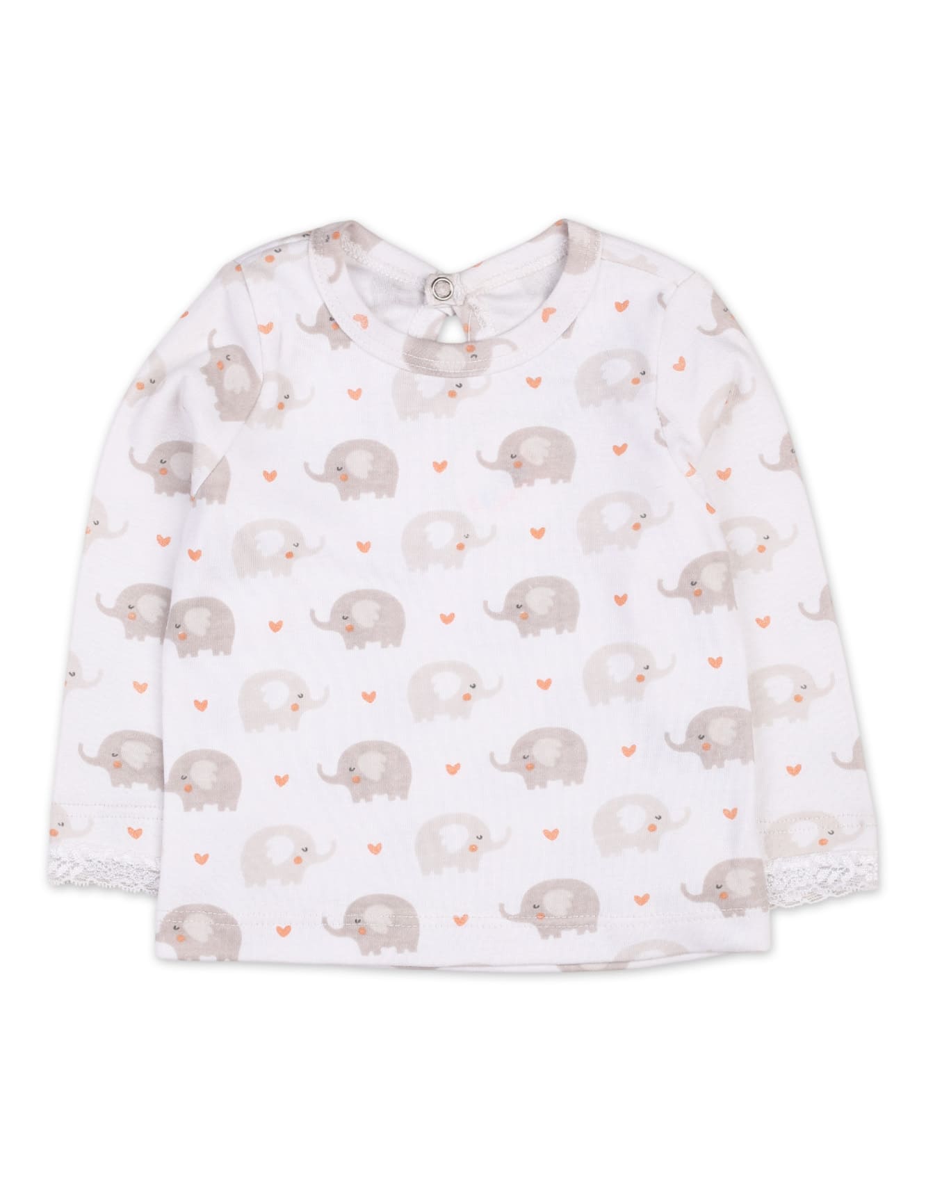 This beautiful outfit includes a long-sleeve white top adorned with an adorable elephant and heart print, paired with a vibrant orange dungaree featuring delicate ruffled straps, button detailing, and lace trim for the perfect touch of sweetness.