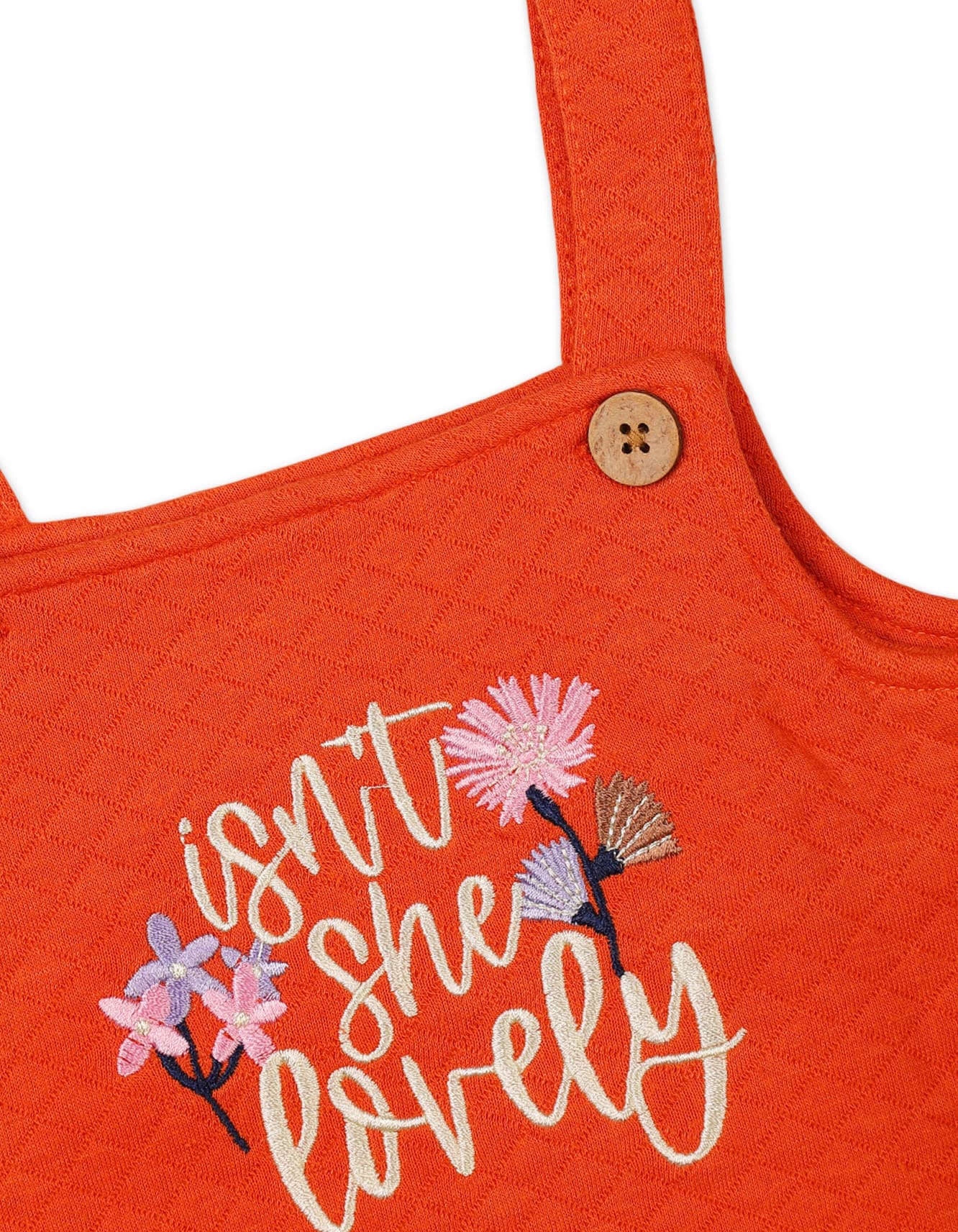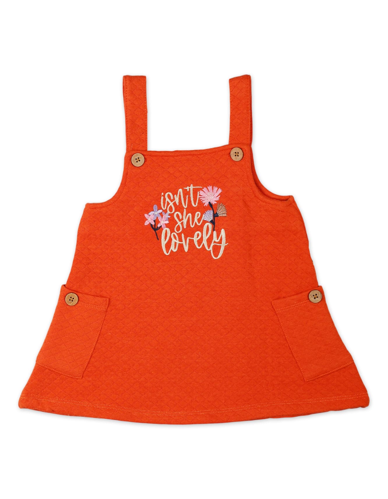 Layered over it is the red textured pinafore dress, crafted with premium stitching and a slightly flared silhouette for easy movement. The adjustable shoulder straps with button detailing add both functionality and style, while the embroidered text detail on the front enhances the outfit’s playful yet elegant appeal. Two front pockets complete the look, making it both fashionable and practical.