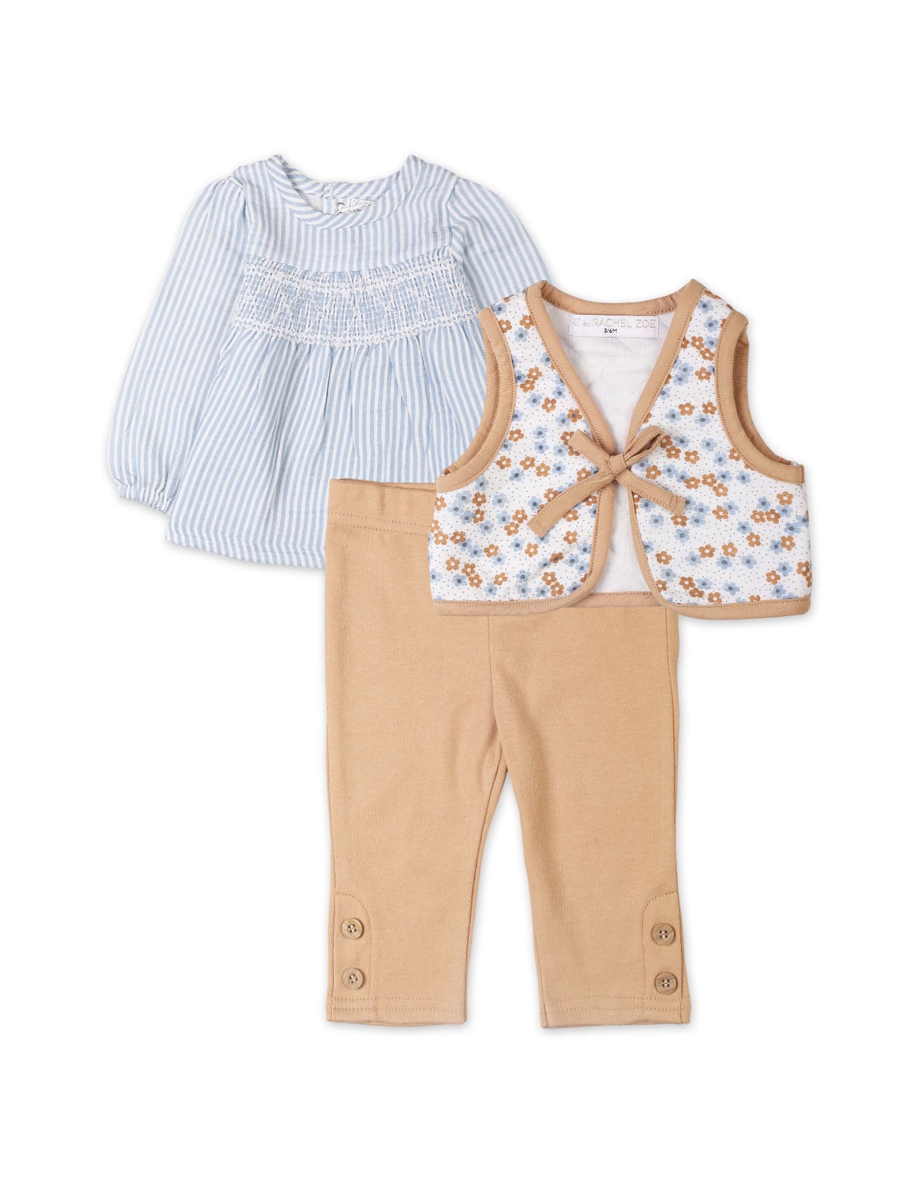 Give your little girl the perfect blend of elegance, comfort, and timeless fashion with the Bambies Baby 3 Piece Suit Sets , now available exclusively at Zubaidas. Designed with meticulous attention to detail and crafted for all-day comfort, this adorable 3-piece outfit features a beautifully smocked blue striped top, a soft floral printed vest, and premium light brown leggings.