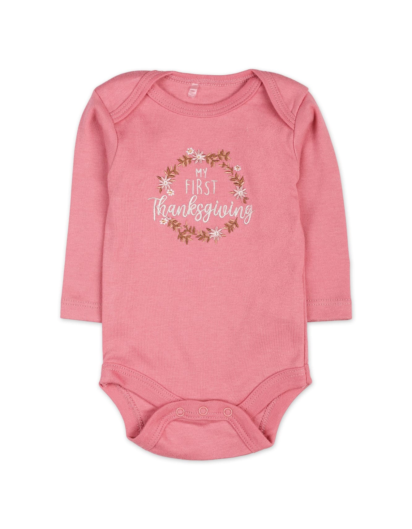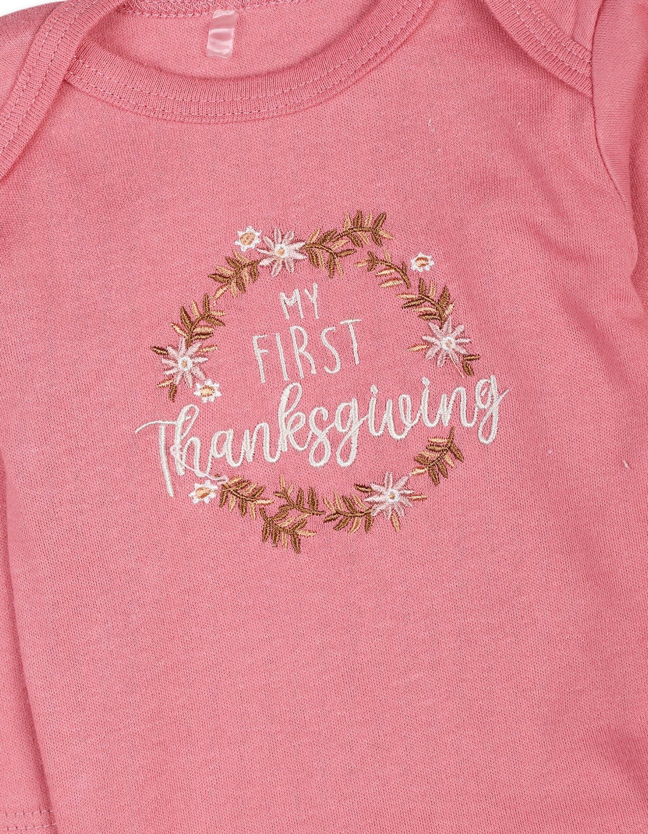 A pink long-sleeve bodysuit featuring the text "My First Thanksgiving" surrounded by an elegant floral wreath.