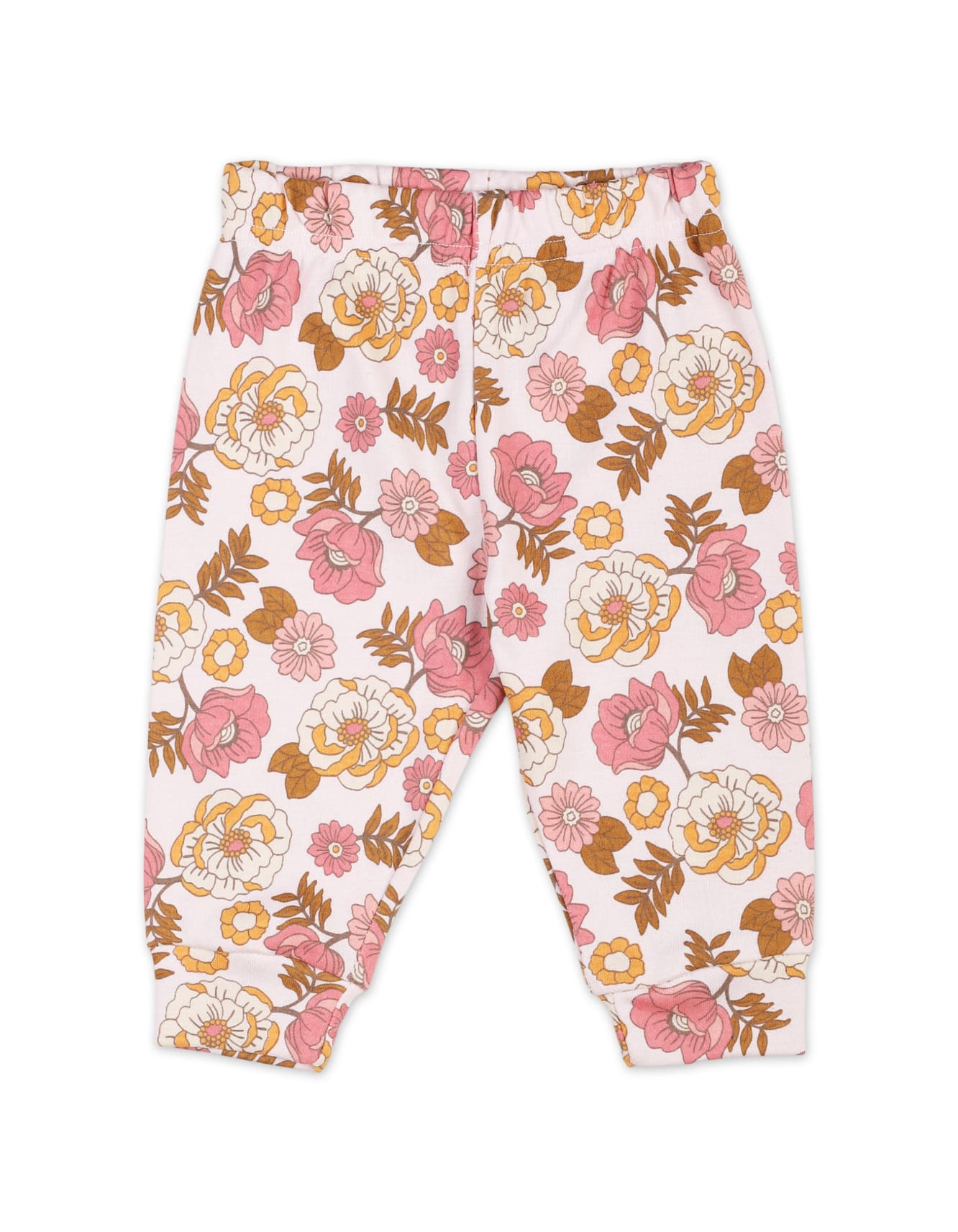 Soft floral printed trousers with delightful pink, mustard, and white tones, crafted for stretchable comfort.